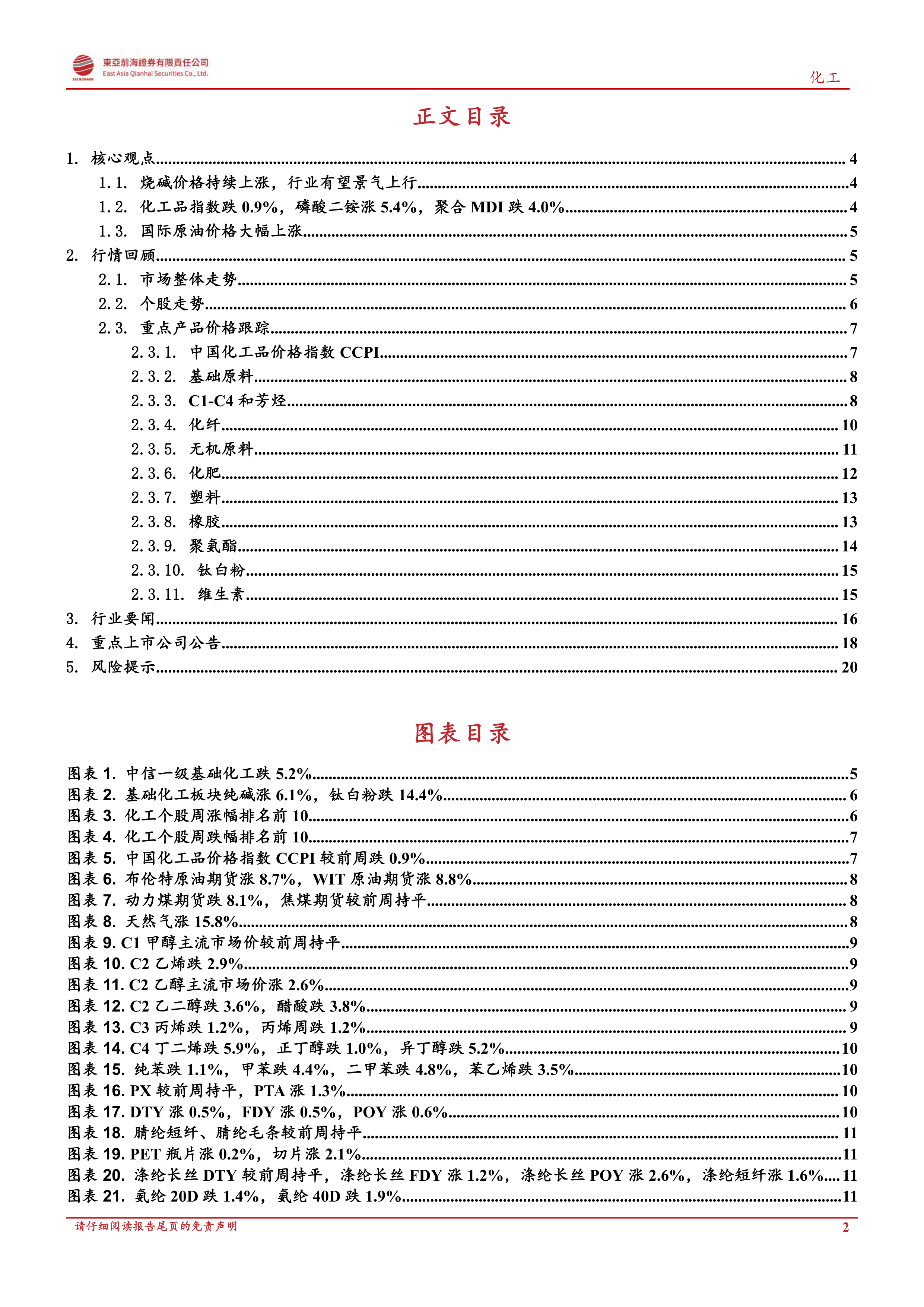本报告的核心观点是:烧碱行业景气度上行,价格持续上涨,主要受下游氧化铝产能释放驱动需求增长,以及“双碳”政策下新增产能受限的共同影响。同时,国际原油价格大幅上涨,而国内化工产品价格涨跌不一。