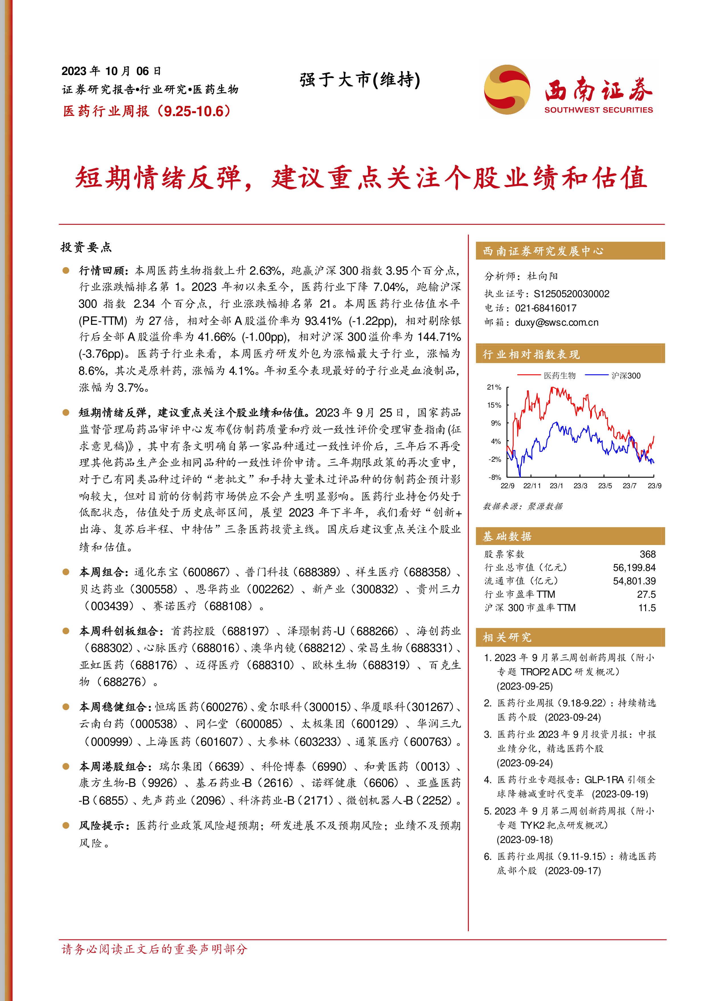 本报告对医药行业近期市场表现进行了全面分析,并结合政策新闻和研究报告,提出了短期情绪反弹但长期需关注个股业绩和估值的观点。 报告建议投资者重点关注“创新+出海、复苏后半程、中特估”三条投资主线,并提供了多个投资组合建议,以满足不同投资者的需求。 报告中包含的大量数据和信息,为投资者进行投资决策提供了重要的参考依据。 然而,投资者仍需注意报告中提到的风险提示,并根据自身情况进行独立判断。