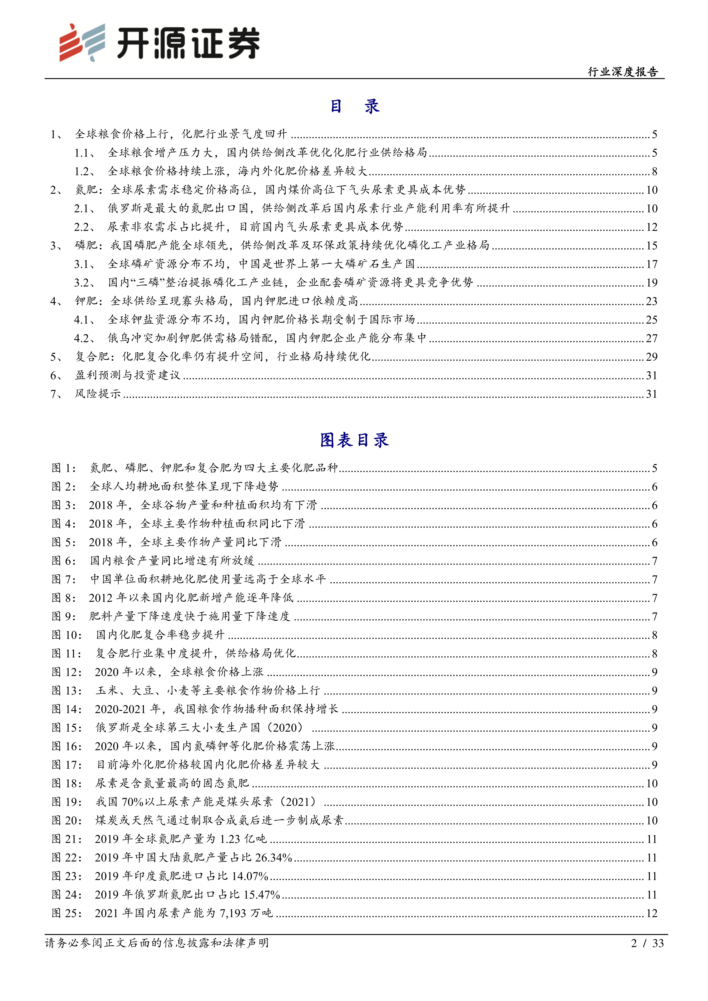 本报告分析了全球粮食安全形势、化肥市场供需格局以及国内化肥行业政策环境,指出全球粮食价格上涨和俄乌冲突导致化肥价格大幅上涨,化肥行业景气度回升。国内化肥行业供给侧改革和环保政策持续优化行业格局,行业集中度提升,拥有资源优势和产业链一体化优势的企业将受益。报告还对相关上市公司进行了盈利预测和估值,并给出了投资建议,同时指出了潜在的风险。 未来,化肥行业的发展将受到全球粮食安全形势、国际地缘政治以及国内政策环境等多重因素的影响。