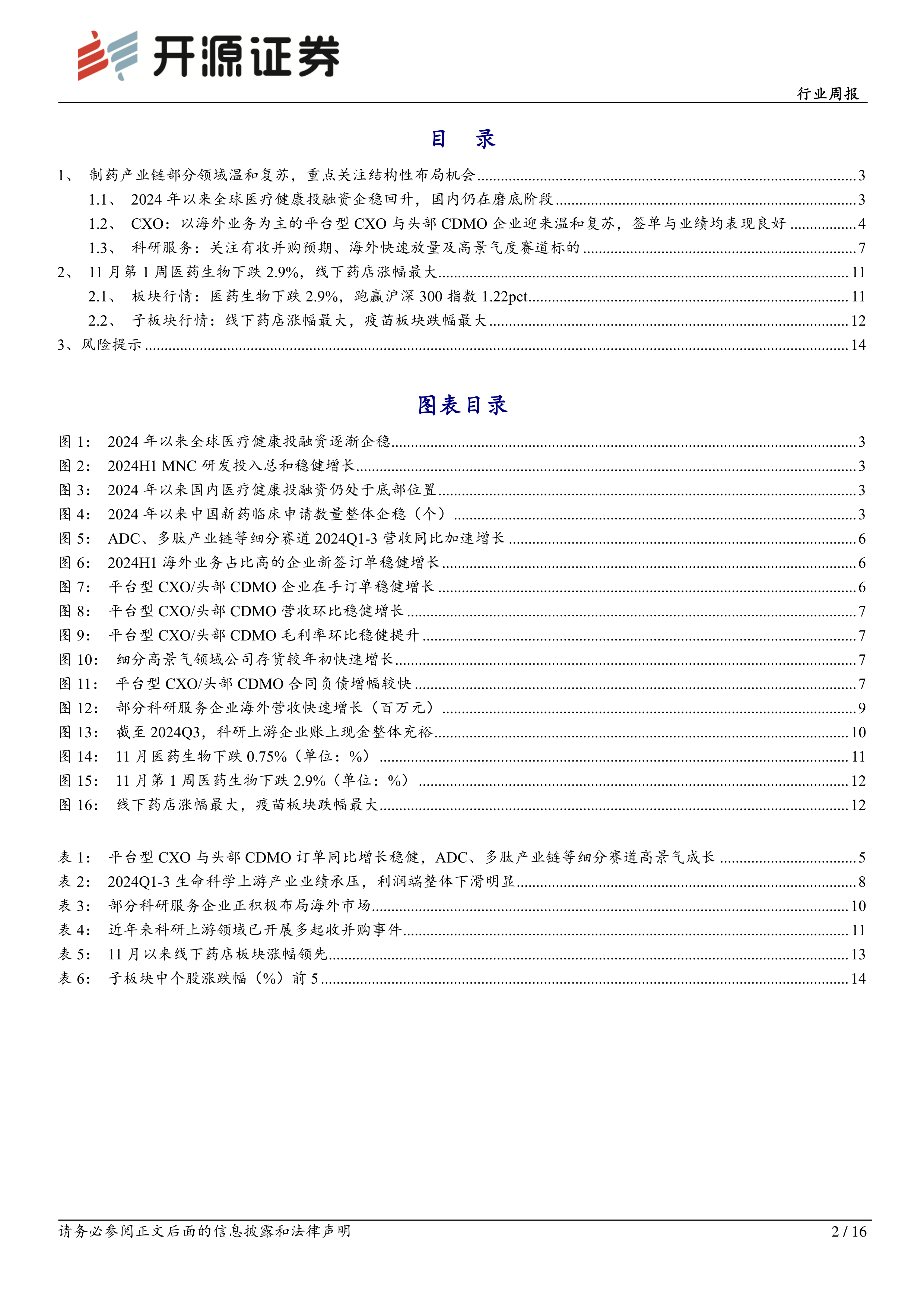 本报告的核心观点是:医药生物制药产业链温和复苏趋势已现,但复苏程度和速度因细分领域而异。全球医疗健康投融资已企稳回升,但国内市场仍处于磨底阶段。CXO行业中,以海外业务为主的平台型CXO和头部CDMO企业率先复苏,而以国内业务为主的企业仍在磨底。科研服务领域也呈现结构性机会,海外市场增长强劲,国内市场则需关注具有α能力的细分领域标的。建议投资者关注结构性布局机会,重点关注高景气赛道(如ADC和多肽产业链)、海外业务占比较高的企业以及估值较低的头部企业。