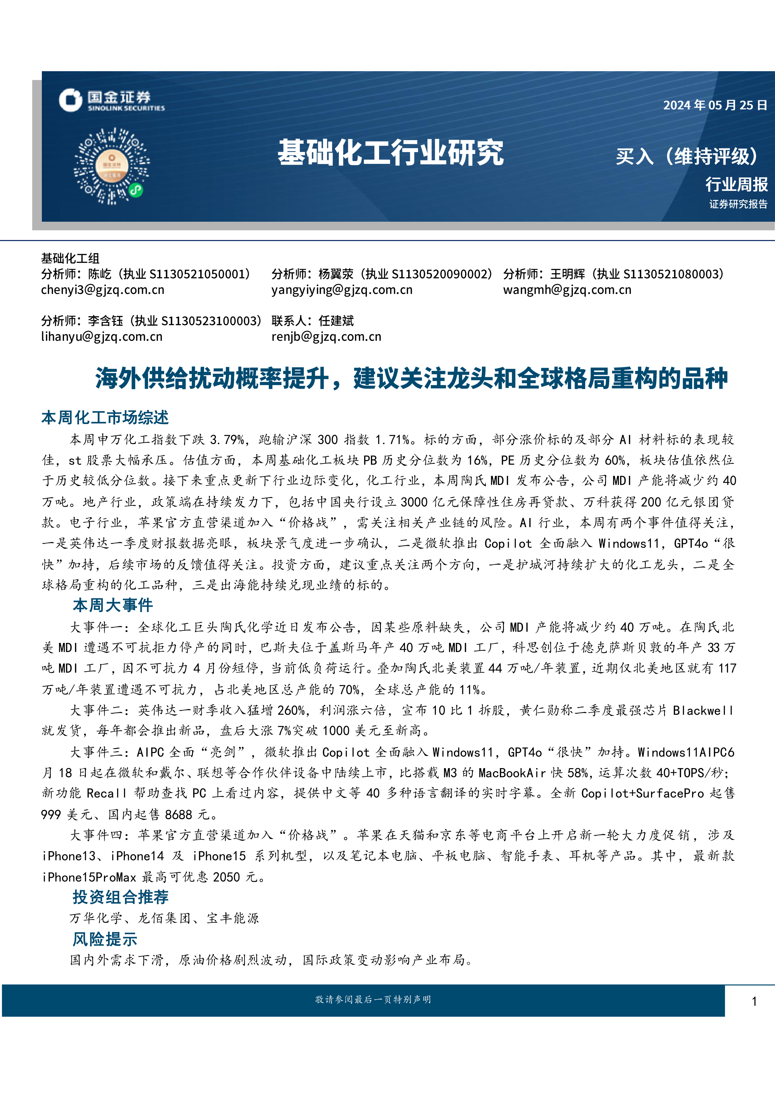 本周申万化工指数下跌3.79%,跑输沪深300指数1.71%。标的方面,部分涨价标的及部分AI材料标的表现较佳,st股票大幅承压。估值方面,本周基础化工板块PB历史分位数为16%,PE历史分位数为60%,板块估值依然位于历史较低分位数。接下来重点更新下行业边际变化,化工行业,本周陶氏MDI发布公告,公司MDI产能将减少约40万吨。地产行业,政策端在持续发力下,包括中国央行设立3000亿元保障性住房再贷款、万科获得200亿元银团贷款。电子行业,苹果官方直营渠道加入“价格战”,需关注相关产业链的风险。AI行业,本周有两个事件值得关注,一是英伟达一季度财报数据亮眼,板块景气度进一步确认,二是微软推出Copilot全面融入Windows11,GPT4o“很快”加持,后续市场的反馈值得关注。投资方面,建议重点关注两个方向,一是护城河持续扩大的化工龙头,二是全球格局重构的化工品种,三是出海能持续兑现业绩的标的。