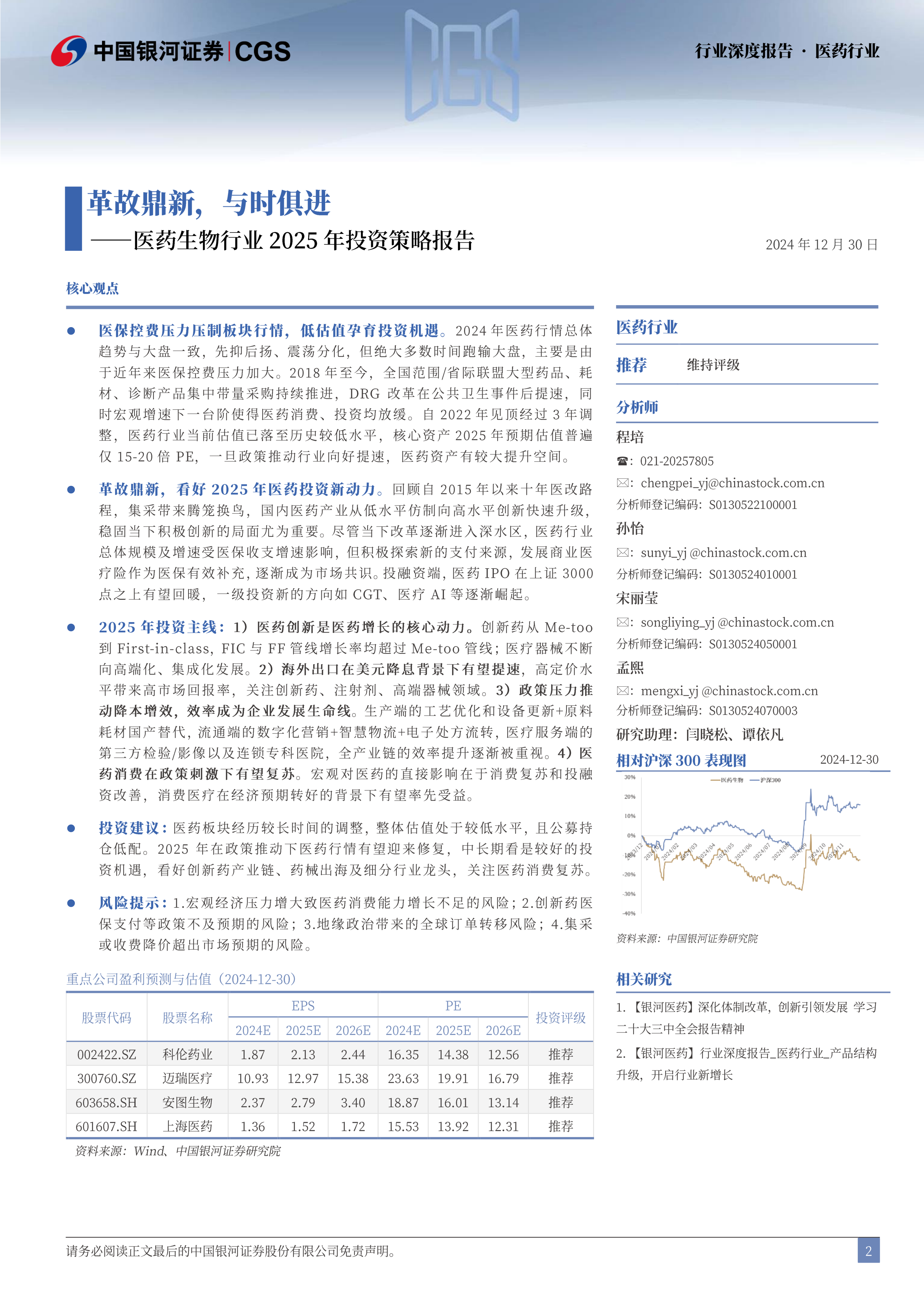 革故鼎新,看好2025年医药投资新动力。回顾自2015年以来十年医改路程,集采带来腾笼换鸟,国内医药产业从低水平仿制向高水平创新快速升级,稳固当下积极创新的局面尤为重要。尽管当下改革逐渐进入深水区,医药行业总体规模及增速受医保收支增速影响,但积极探索新的支付来源,发展商业医疗险作为医保有效补充,逐渐成为市场共识。投融资端,医药IPO在上证3000点之上有望回暖,一级投资新的方向如CGT、医疗AI等逐渐崛起。