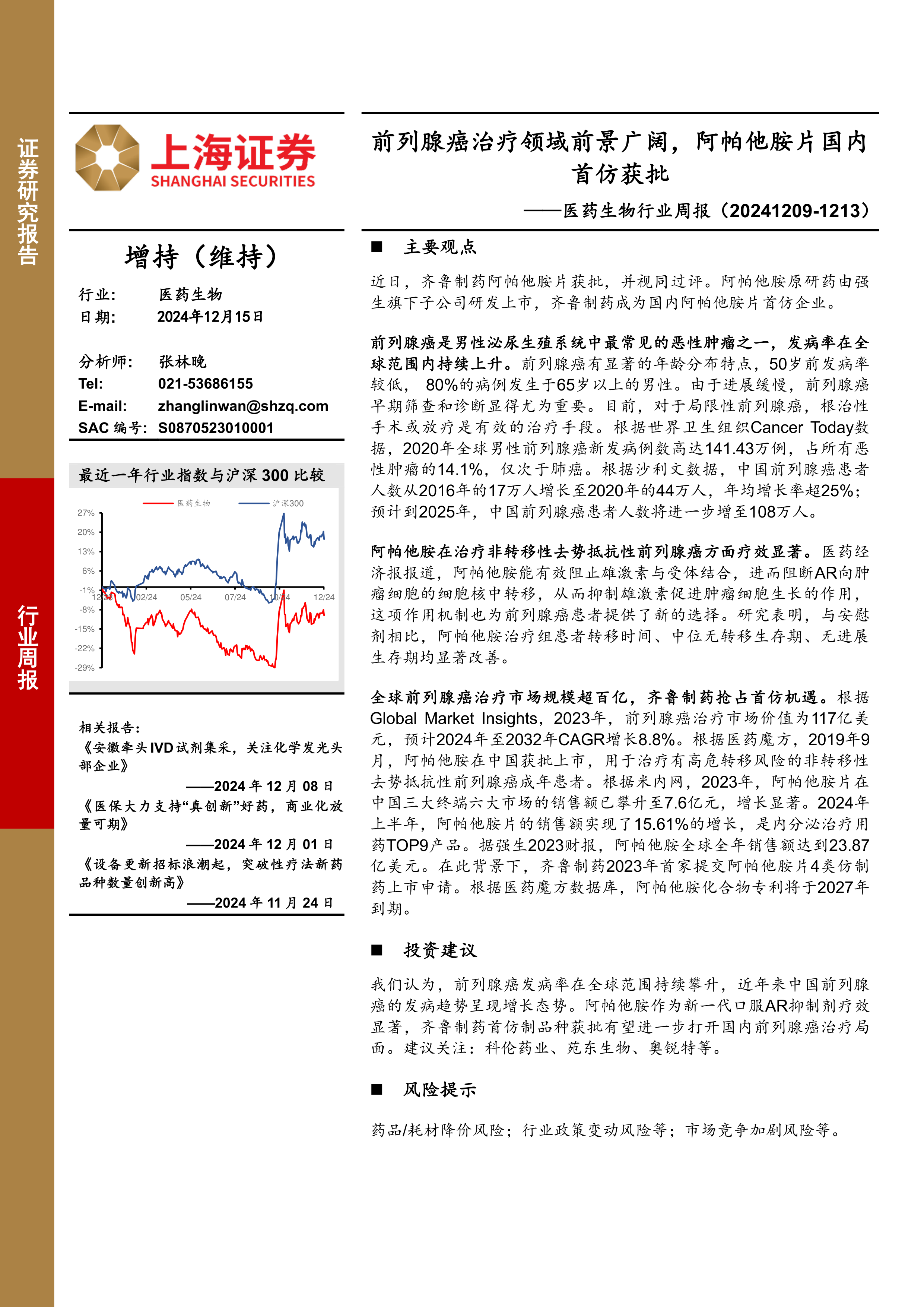 医药生物行业周报:前列腺癌治疗领域前景广阔,阿帕他胺片国内首仿获批