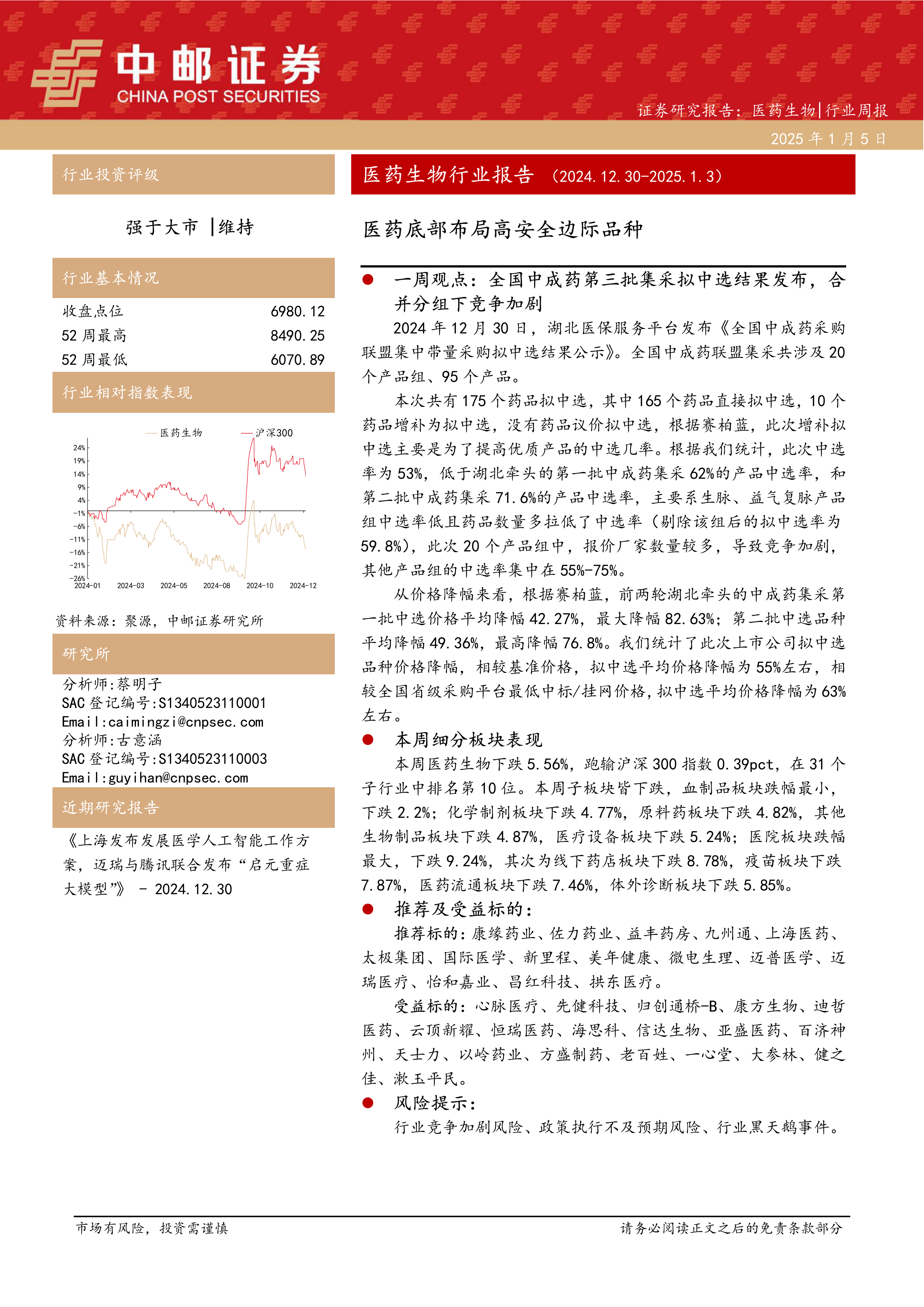 本报告基于全国中成药第三批集采结果及本周医药生物行业表现,对医药生物行业进行了全面的分析。报告指出,集采政策加剧了行业竞争,导致价格下降,但同时也为部分细分板块带来了新的投资机会。报告建议投资者关注具备高景气度、集采促进、困境反转以及低估值特征的标的,并需谨慎关注行业竞争加剧、政策执行不及预期以及行业黑天鹅事件等风险。 报告中推荐和受益标的涵盖了多个细分领域,为投资者提供了较为全面的投资参考。 然而,投资者仍需进行独立判断,并结合自身风险承受能力做出投资决策。