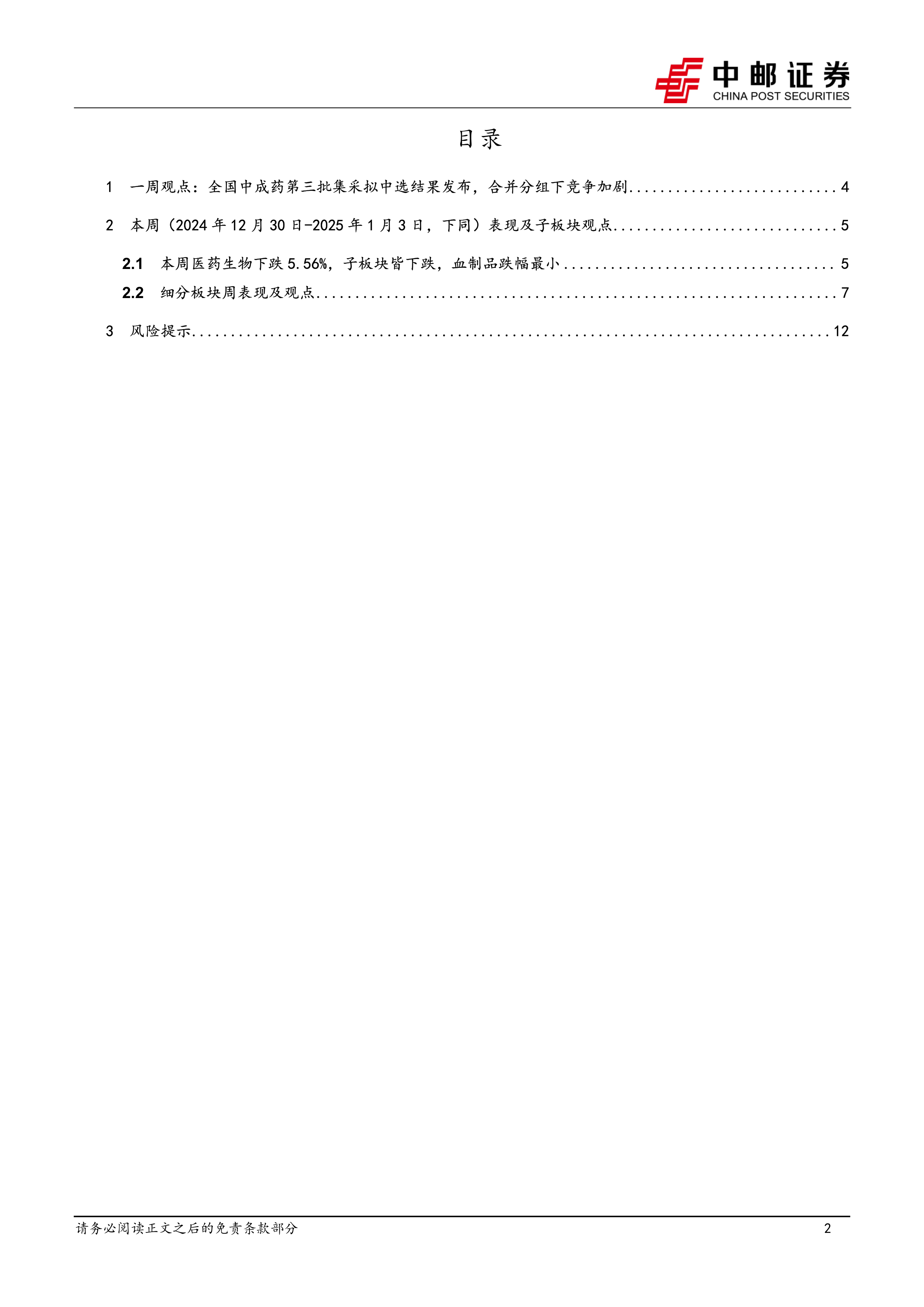 本报告的核心观点是:全国中成药第三批集采结果显示,合并分组导致竞争加剧,中选率下降,价格降幅加大。医药生物行业整体下跌,但部分细分板块如医疗设备和血制品表现相对较好,存在投资机会。报告建议关注具备高景气度、集采促进、困境反转以及低估值特征的标的,并提示行业竞争加剧、政策执行不及预期以及行业黑天鹅事件等风险。