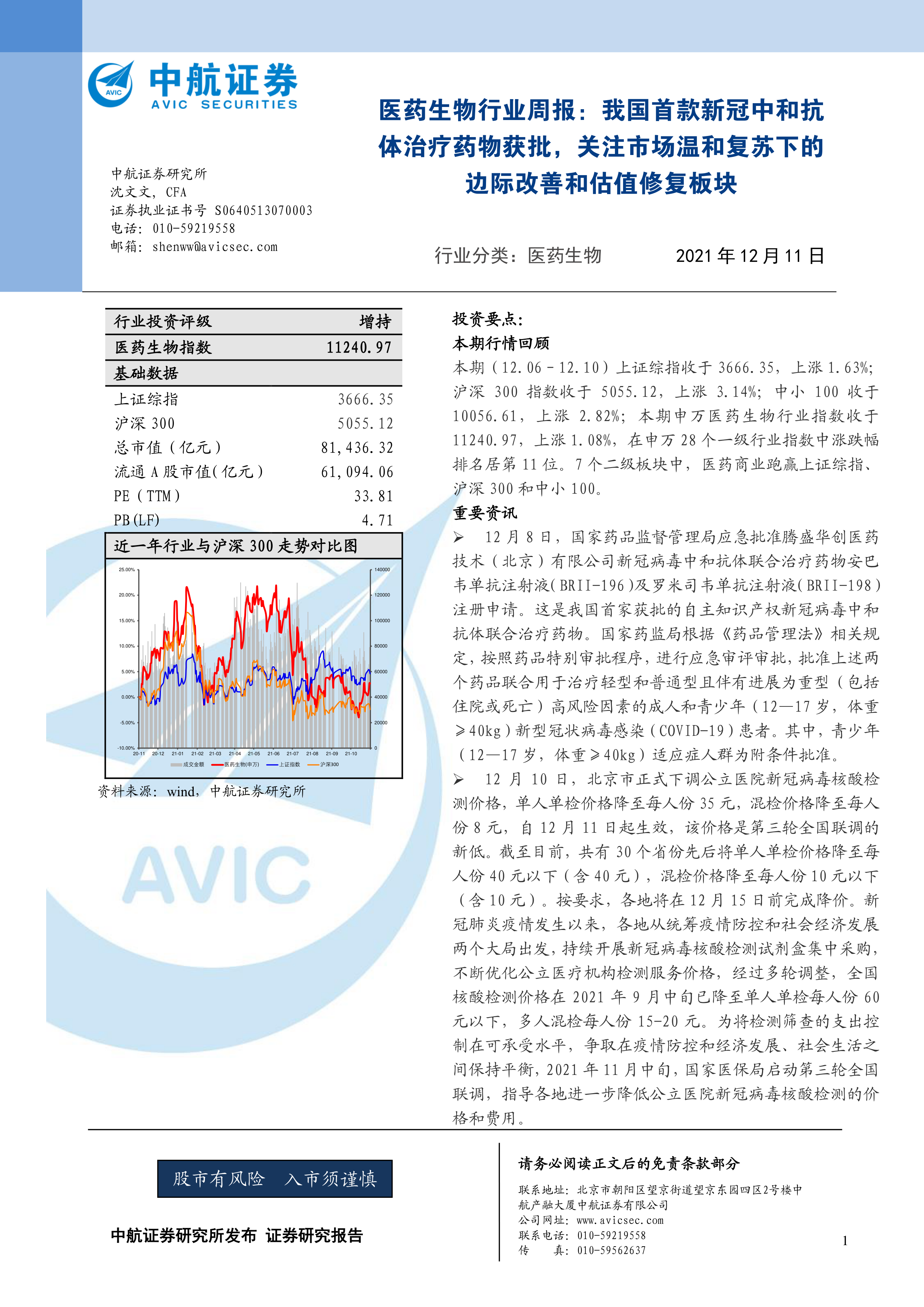 医药生物行业周报:我国首款新冠中和抗体治疗药物获批,关注市场温和复苏下的边际改善和估值修复板块