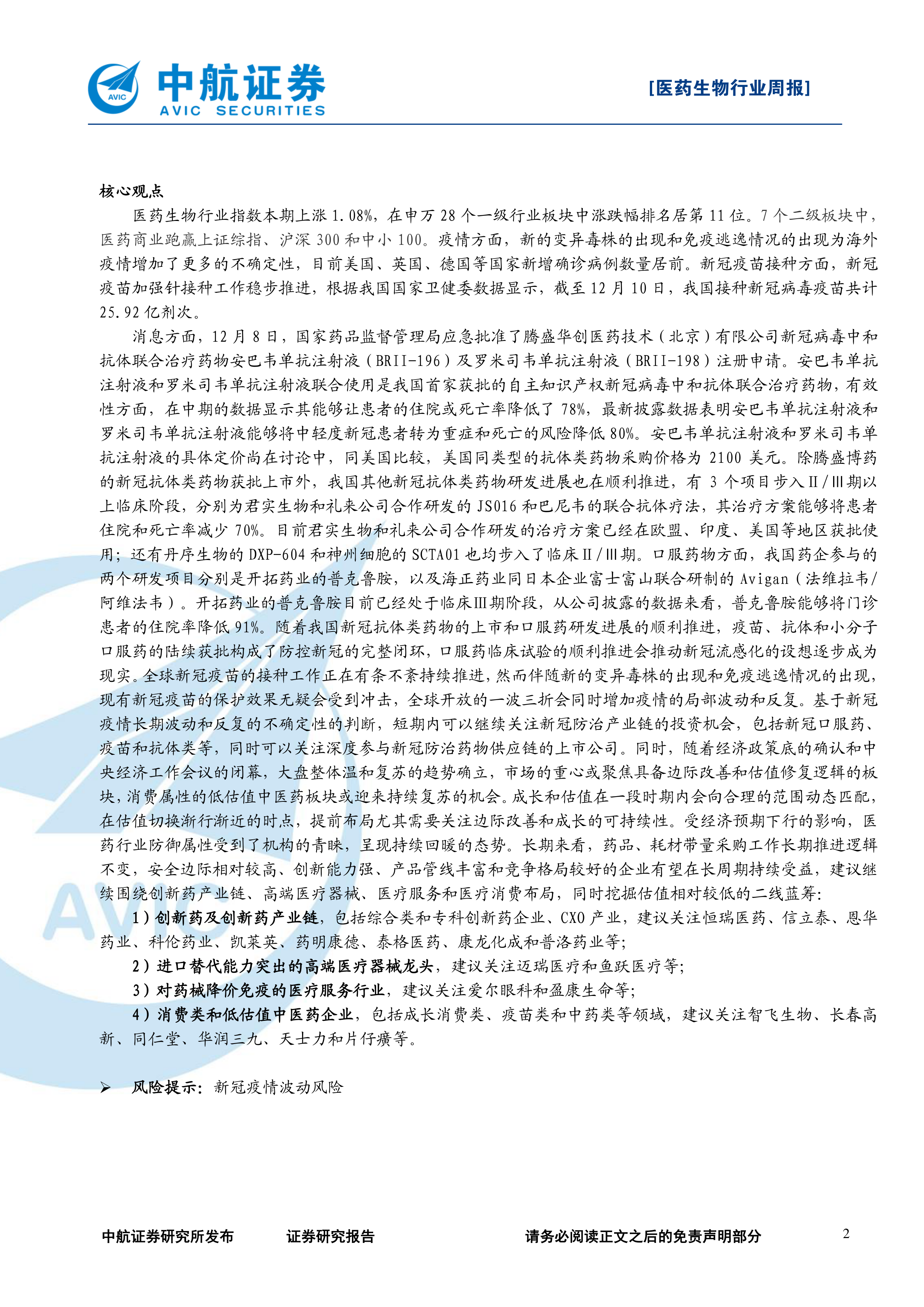 消息方面, 12 月 8 日,国家药品监督管理局应急批准了腾盛华创医药技术(北京)有限公司新冠病毒中和抗体联合治疗药物安巴韦单抗注射液(BRII-196)及罗米司韦单抗注射液(BRII-198)注册申请。安巴韦单抗注射液和罗米司韦单抗注射液联合使用是我国首家获批的自主知识产权新冠病毒中和抗体联合治疗药物,有效性方面,在中期的数据显示其能够让患者的住院或死亡率降低了 78%,最新披露数据表明安巴韦单抗注射液和罗米司韦单抗注射液能够将中轻度新冠患者转为重症和死亡的风险降低 80%。安巴韦单抗注射液和罗米司韦单抗注射液的具体定价尚在讨论中,同美国比较,美国同类型的抗体类药物采购价格为 2100 美元。除腾盛博药的新冠抗体类药物获批上市外,我国其他新冠抗体类药物研发进展也在顺利推进,有 3 个项目步入Ⅱ/Ⅲ期以上临床阶段, 分别为君实生物和礼来公司合作研发的 JS016 和巴尼韦的联合抗体疗法,其治疗方案能够将患者住院和死亡率减少 70%。目前君实生物和礼来公司合作研发的治疗方案已经在欧盟、印度、美国等地区获批使用;还有丹序生物的 DXP-604 和神州细胞的 SCTA01 也均步入了临床Ⅱ/Ⅲ期。口服药物方面,我国药企参与的两个研发项目分别是开拓药业的普克鲁胺,以及海正药业同日本企业富士富山联合研制的 Avigan(法维拉韦/阿维法韦)。开拓药业的普克鲁胺目前已经处于临床Ⅲ期阶段,从公司披露的数据来看,普克鲁胺能够将门诊患者的住院率降低 91%。随着我国新冠抗体类药物的上市和口服药研发进展的顺利推进,疫苗、抗体和小分子口服药的陆续获批构成了防控新冠的完整闭环,口服药临床试验的顺利推进会推动新冠流感化的设想逐步成为现实。 全球新冠疫苗的接种工作正在有条不紊持续推进, 然而伴随新的变异毒株的出现和免疫逃逸情况的出现,现有新冠疫苗的保护效果无疑会受到冲击,全球开放的一波三折会同时增加疫情的局部波动和反复。基于新冠疫情长期波动和反复的不确定性的判断,短期内可以继续关注新冠防治产业链的投资机会,包括新冠口服药、疫苗和抗体类等,同时可以关注深度参与新冠防治药物供应链的上市公司。同时,随着经济政策底的确认和中央经济工作会议的闭幕,大盘整体温和复苏的趋势确立,市场的重心或聚焦具备边际改善和估值修复逻辑的板块,消费属性的低估值中医药板块或迎来持续复苏的机会。 成长和估值在一段时期内会向合理的范围动态匹配,在估值切换渐行渐近的时点,提前布局尤其需要关注边际改善和成长的可持续性。受经济预期下行的影响,医药行业防御属性受到了机构的青睐,呈现持续回暖的态势。长期来看,药品、耗材带量采购工作长期推进逻辑不变,安全边际相对较高、创新能力强、产品管线丰富和竞争格局较好的企业有望在长周期持续受益,建议继续围绕创新药产业链、高端医疗器械、医疗服务和医疗消费布局,同时挖掘估值相对较低的二线蓝筹: