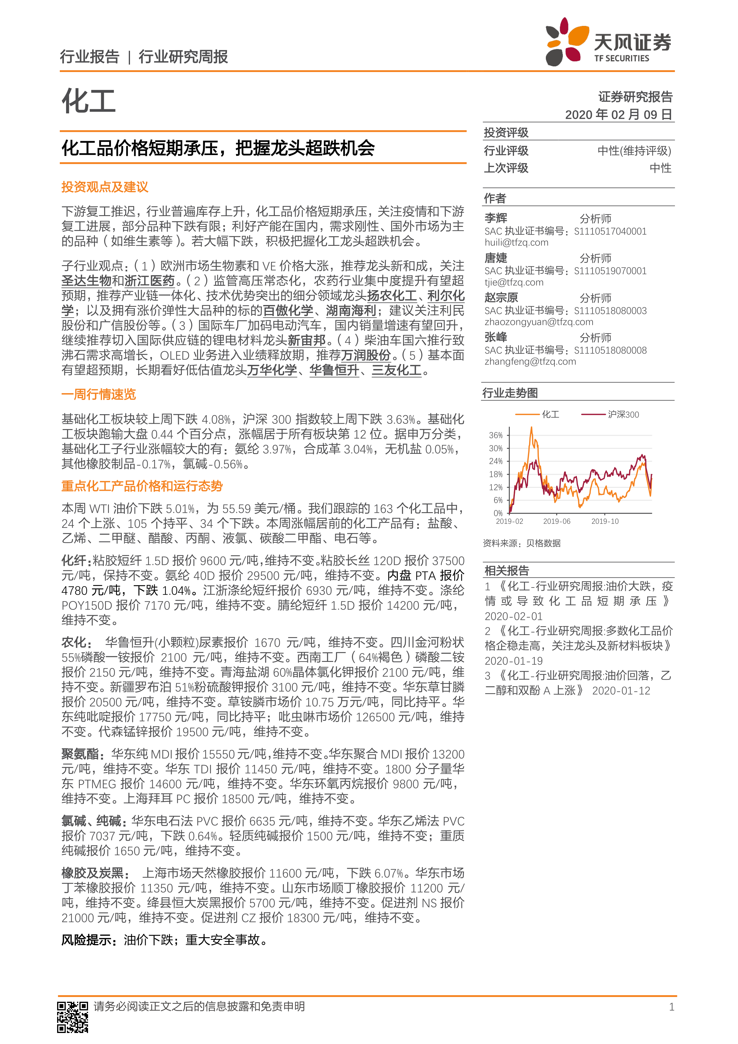 化工行业研究周报:化工品价格短期承压,把握龙头超跌机会