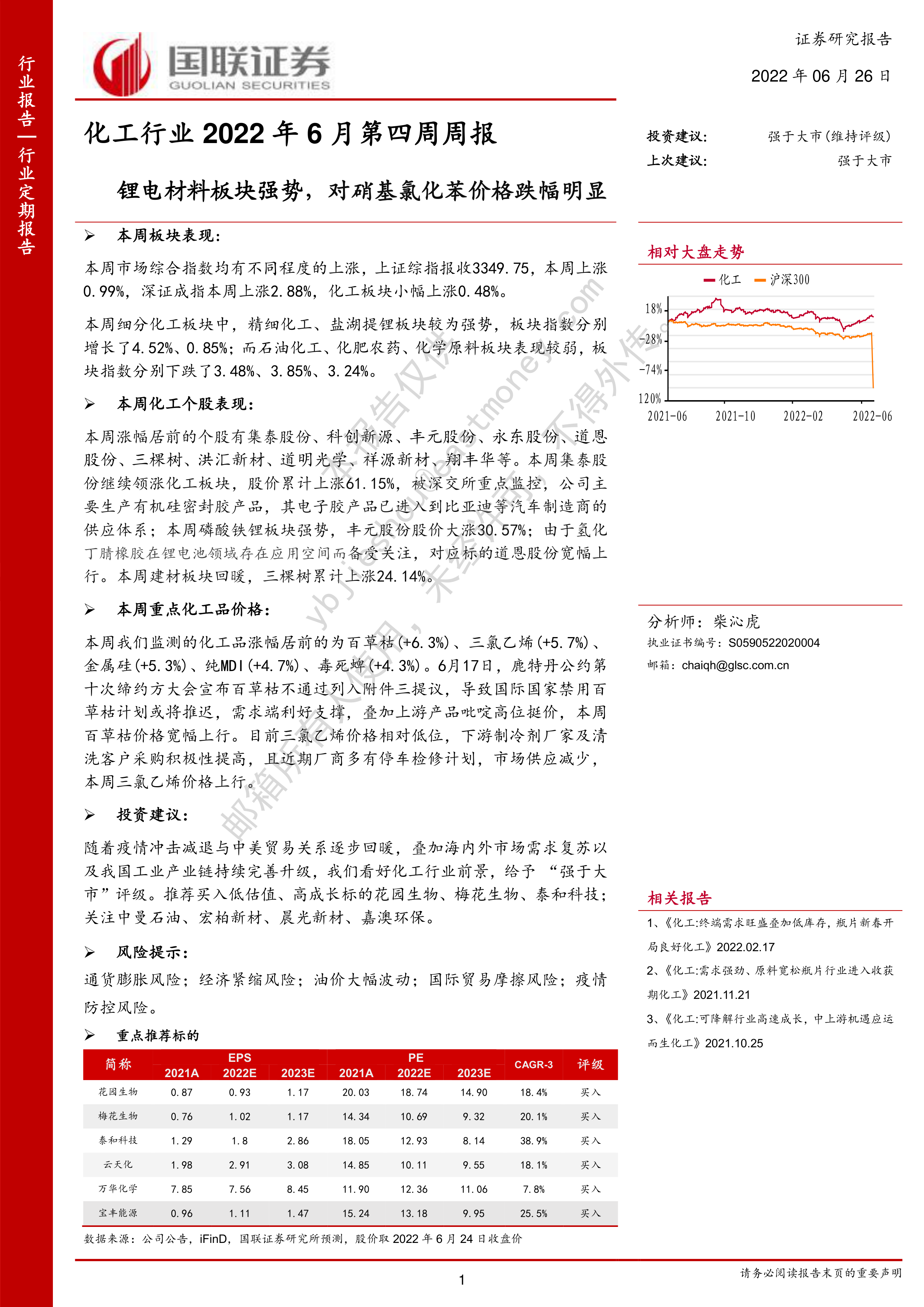 化工行业2022年6月第四周周报:锂电材料板块强势,对硝基氯化苯价格跌幅明显