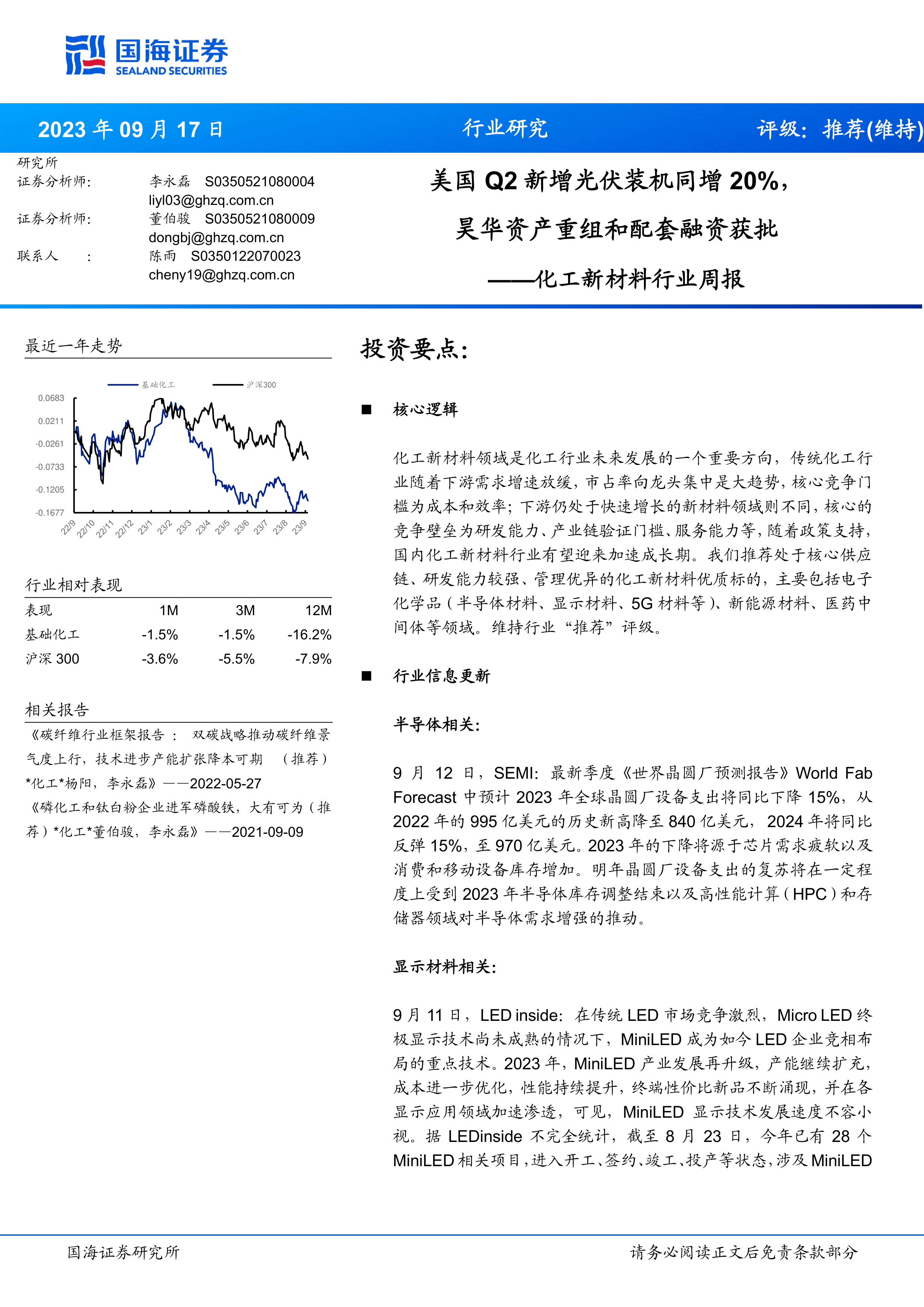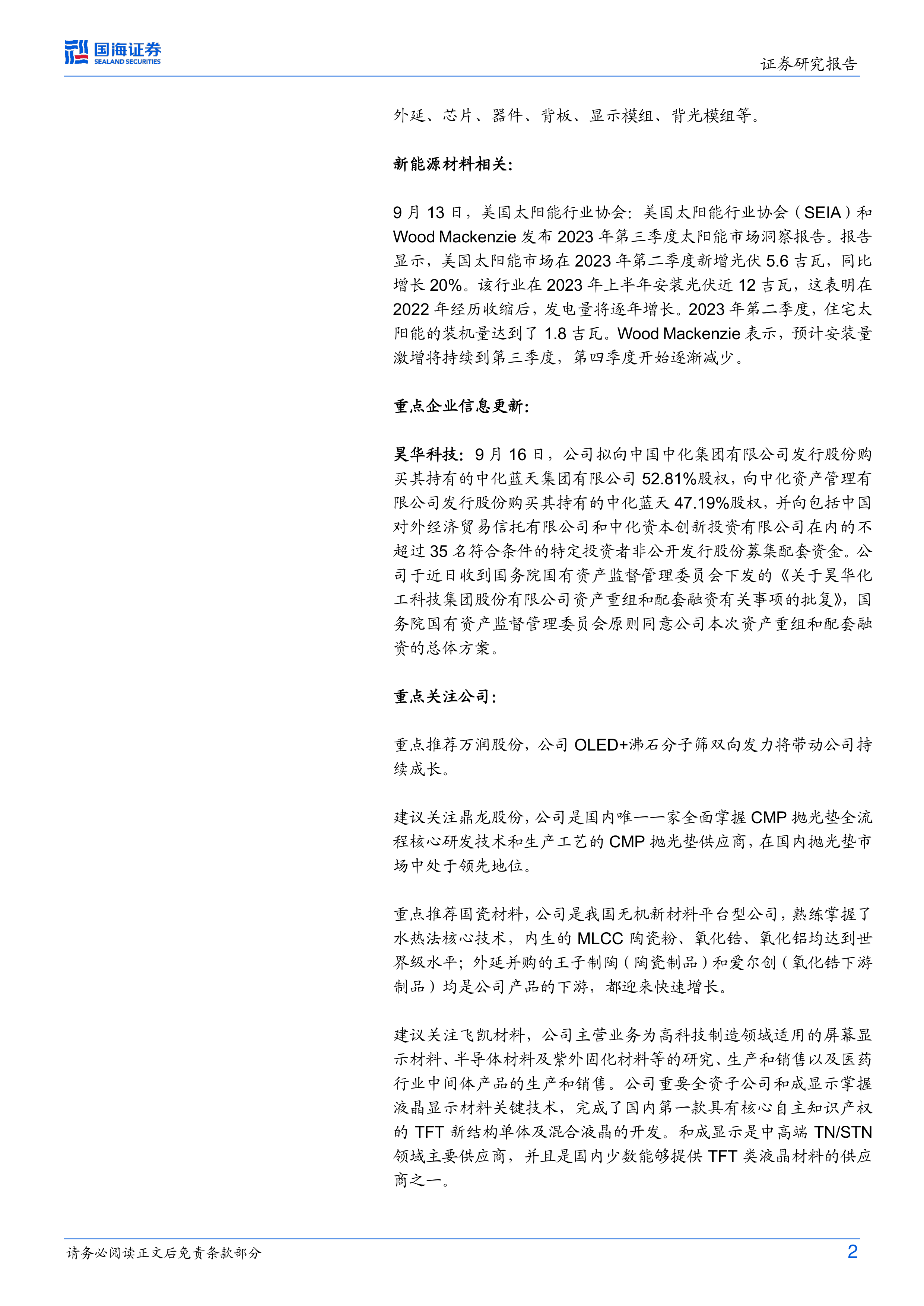 化工新材料行业周报:美国Q2新增光伏装机同增20%,昊华资产重组和配套融资获批