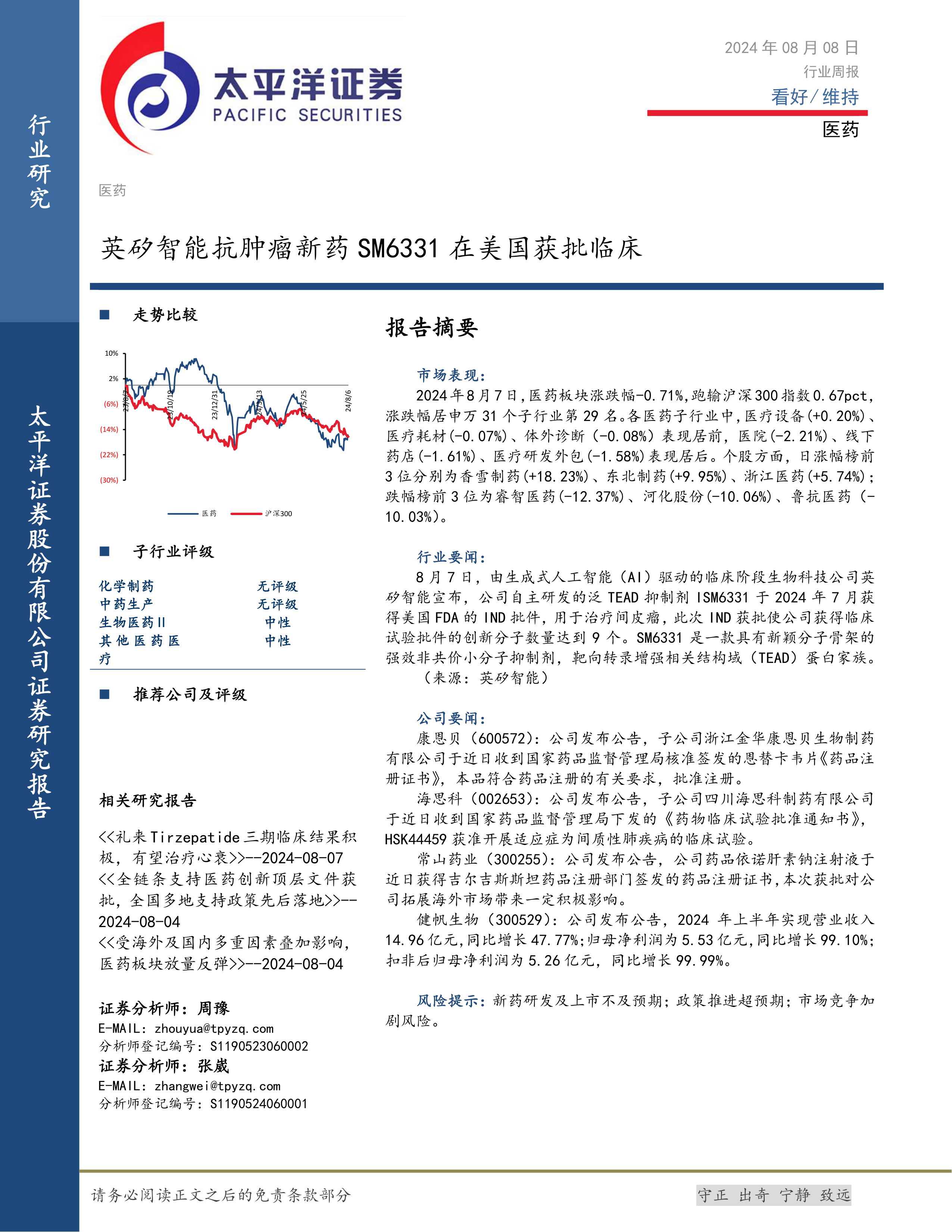 本报告的核心观点是:医药行业整体表现略微下跌,但个别细分领域和公司表现强劲,英矽智能抗肿瘤新药SM6331获批临床试验是行业利好消息。 未来走势需关注新药研发进展、政策变化以及市场竞争等因素。