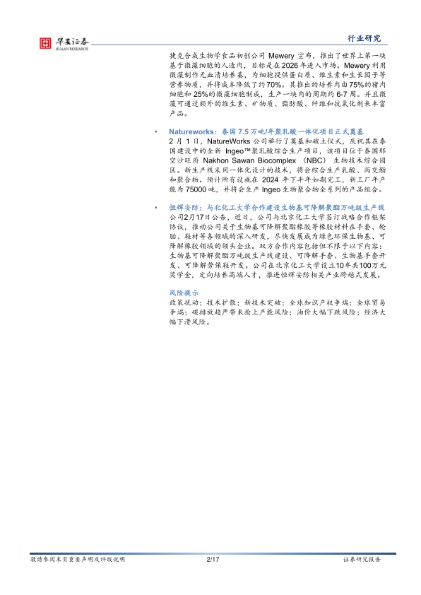 恒辉安防:与北化工大学合作建设生物基可降解聚酯万吨级生产线公司2月17日公告,近日,公司与北京化工大学签订战略合作框架协议,推动公司关于生物基可降解聚酯橡胶等橡胶材料在手套、轮胎、鞋材等各领域的深入研发,尽快发展成为绿色环保生物基、可降解橡胶领域的领头企业。双方合作内容包括但不限于以下内容:生物基可降解聚酯万吨级生产线建设、可降解手套、生物基手套开发、可降解劳保鞋开发。公司在北京化工大学设立10年共100万元奖学金,定向培养高端人才,推进恒辉安防相关产业跨越式发展。