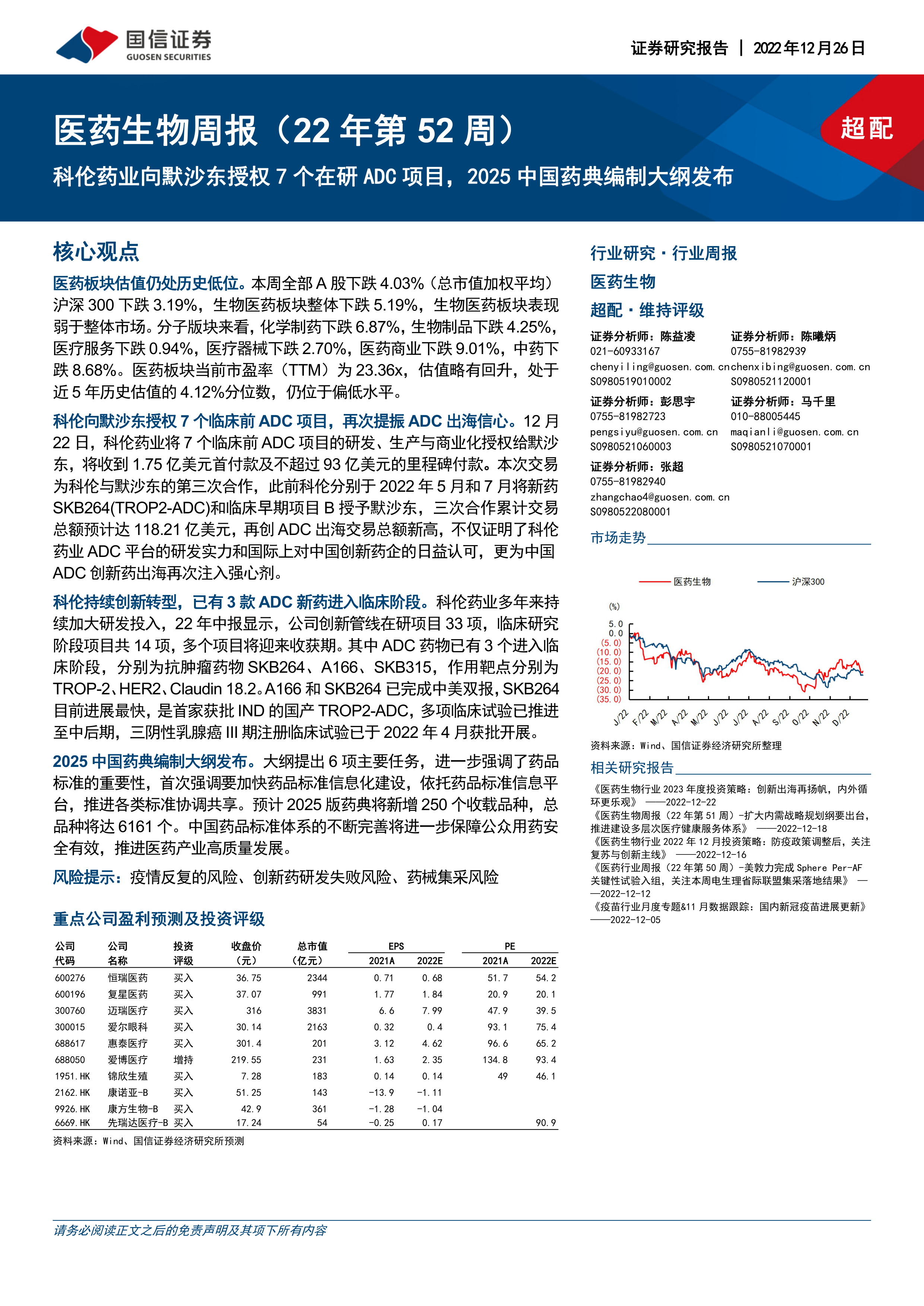 医药生物周报(22年第52周):科伦药业向默沙东授权7个在研ADC项目,2025中国药典编制大纲发布