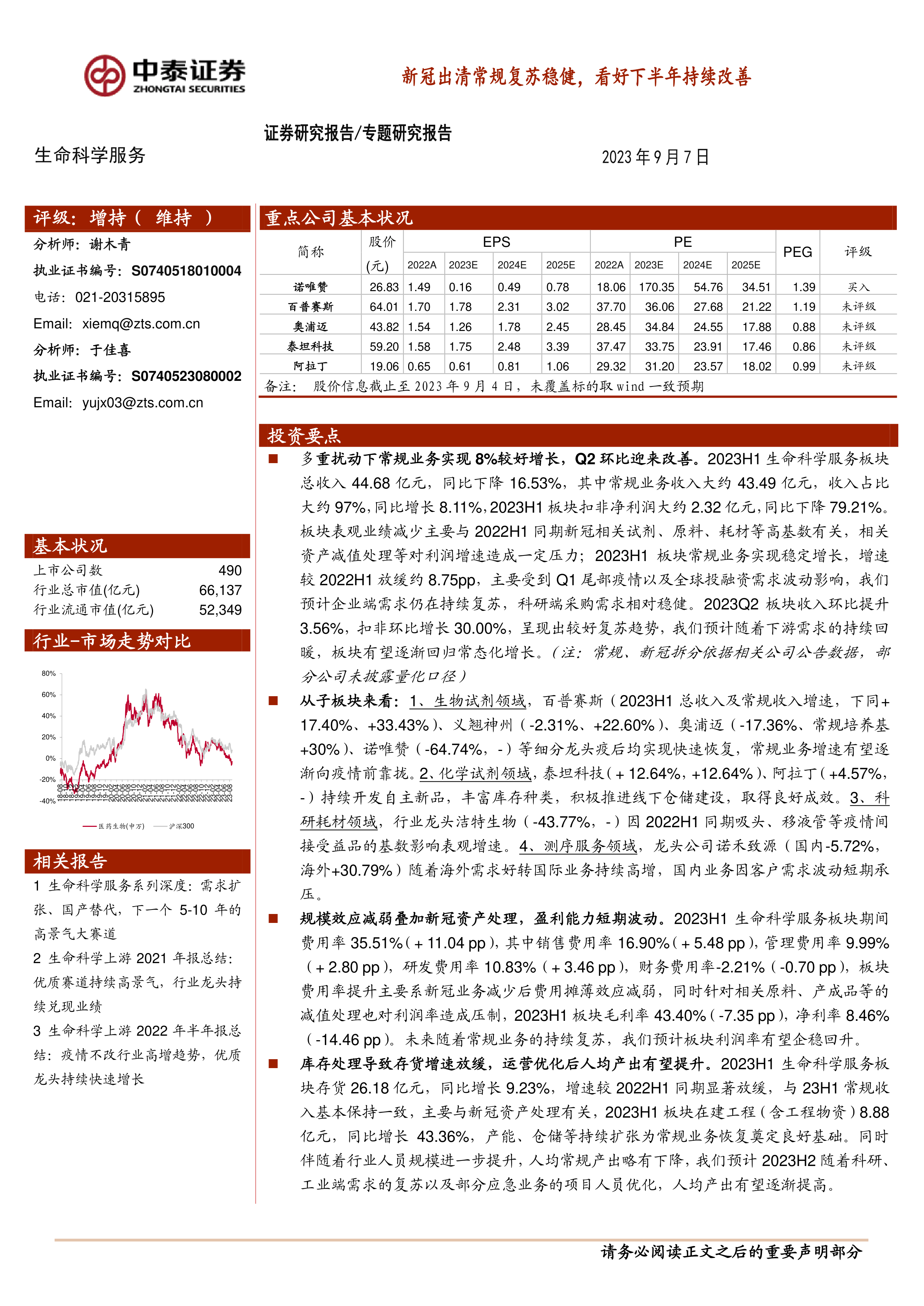 本报告基于对A股9家生命科学服务板块核心标的2023年半年报数据的统计和分析,深入探讨了该行业在新冠疫情影响消退后的发展趋势。 报告指出,尽管受到多重因素的影响,行业常规业务展现出较强的韧性,并于第二季度呈现积极复苏态势。 下半年,随着新冠基数的逐渐消退和下游需求的持续回暖,行业有望迎来业绩加速。 报告建议投资者关注具备强大研发能力和技术实力以及完善渠道网络布局的国产头部企业,并提醒投资者注意潜在的投资风险。 总而言之,本报告为投资者提供了对中国生命科学服务行业未来发展趋势的专业分析和投资建议。