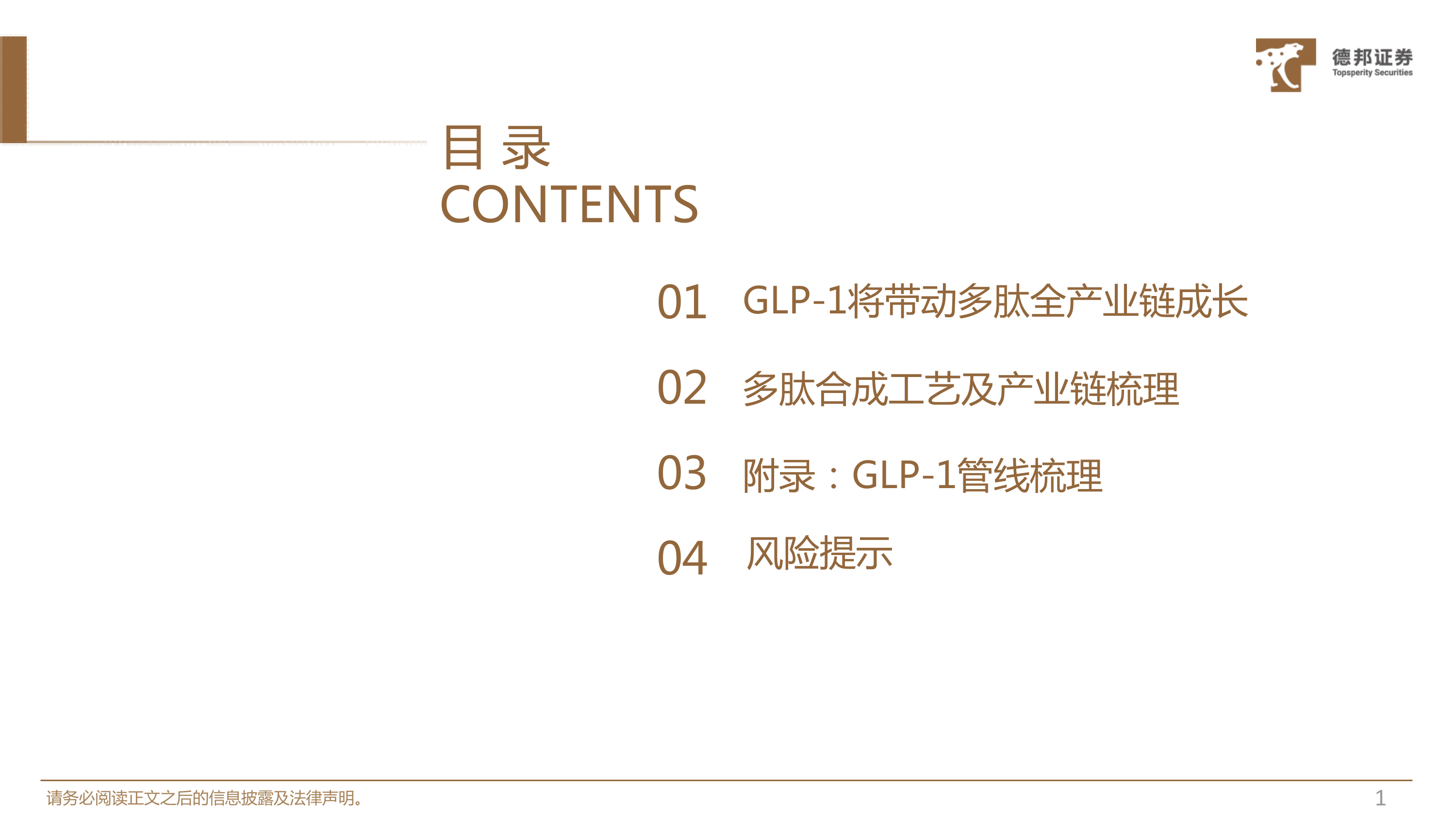 本报告对多肽产业链,特别是GLP-1类药物市场进行了深入分析。GLP-1类药物减肥适应症的拓展将带来巨大的市场机遇,并驱动整个多肽产业链的快速发展。 多肽药物的长效化和新型给药系统是未来发展趋势,而不同合成工艺的选择将影响产品的成本和效率。 投资者应关注GLP-1类药物的研发进展、市场竞争格局以及产业链上关键企业的动态,以把握投资机会。 然而,报告也指出了研发进度不及预期、市场竞争加剧、产品产能不及预期以及政策变化等风险因素,投资者需谨慎评估风险。