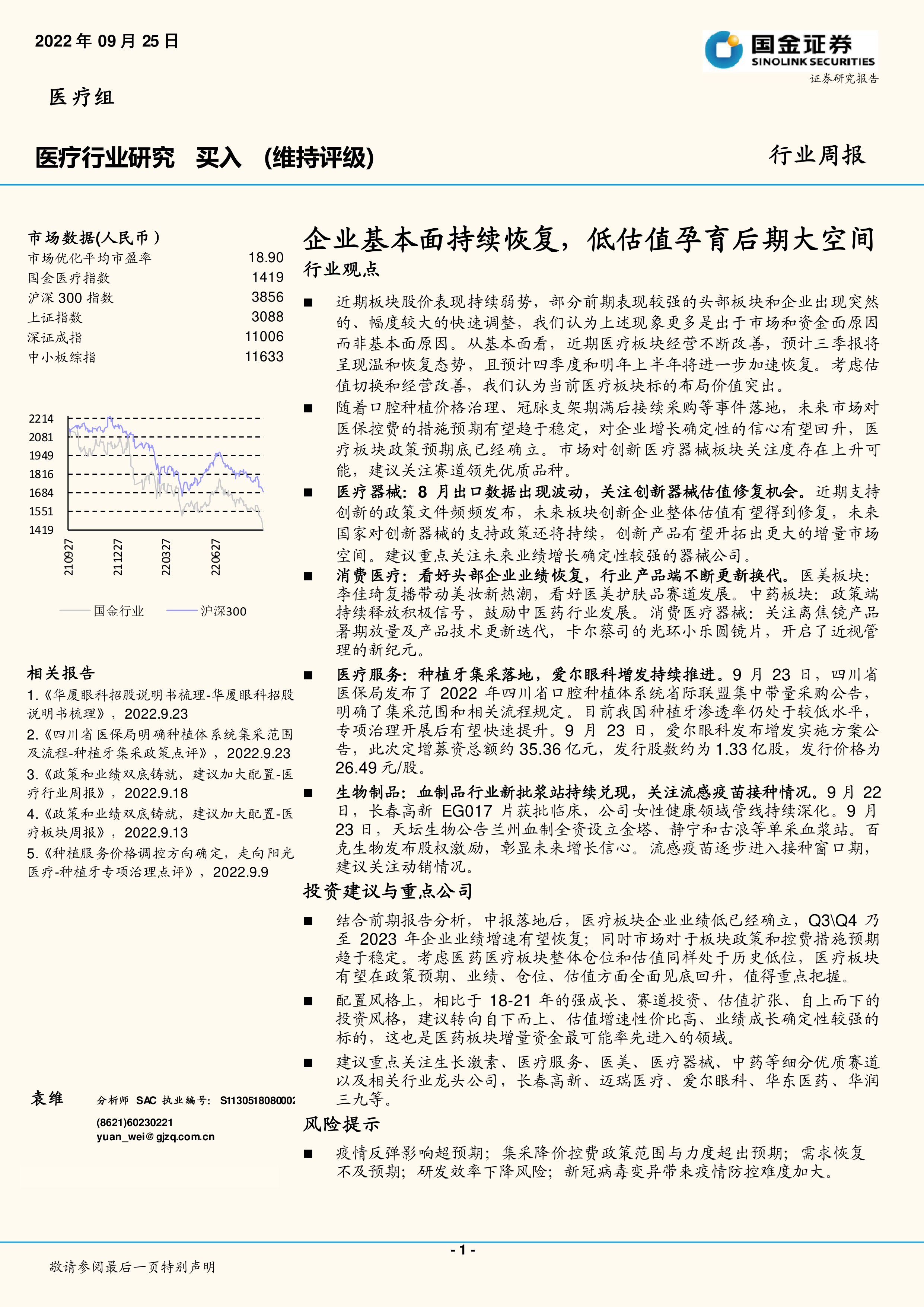 结合前期报告分析,中报落地后,医疗板块企业业绩低已经确立,Q3\Q4乃至2023年企业业绩增速有望恢复;同时市场对于板块政策和控费措施预期趋于稳定。考虑医药医疗板块整体仓位和估值同样处于历史低位,医疗板块有望在政策预期、业绩、仓位、估值方面全面见底回升,值得重点把握。