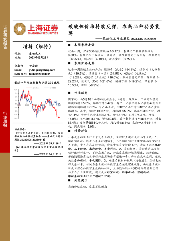 报告详细分析了原油、化纤(涤纶长丝、氨纶、锦纶纤维、粘胶短纤)、PVC、钛白粉、维生素、聚氨酯、农化(草甘膦、尿素、复合肥)和氟化工(制冷剂R22、R134a、R125、R32、R410a)等多个细分行业的动态,并结合国家统计局公布的4月份规模以上工业增加值数据,对行业发展趋势进行了分析。 其中,4月份化学原料和化学制品制造业增加值同比增长7.5%,显示出该行业整体的增长态势。