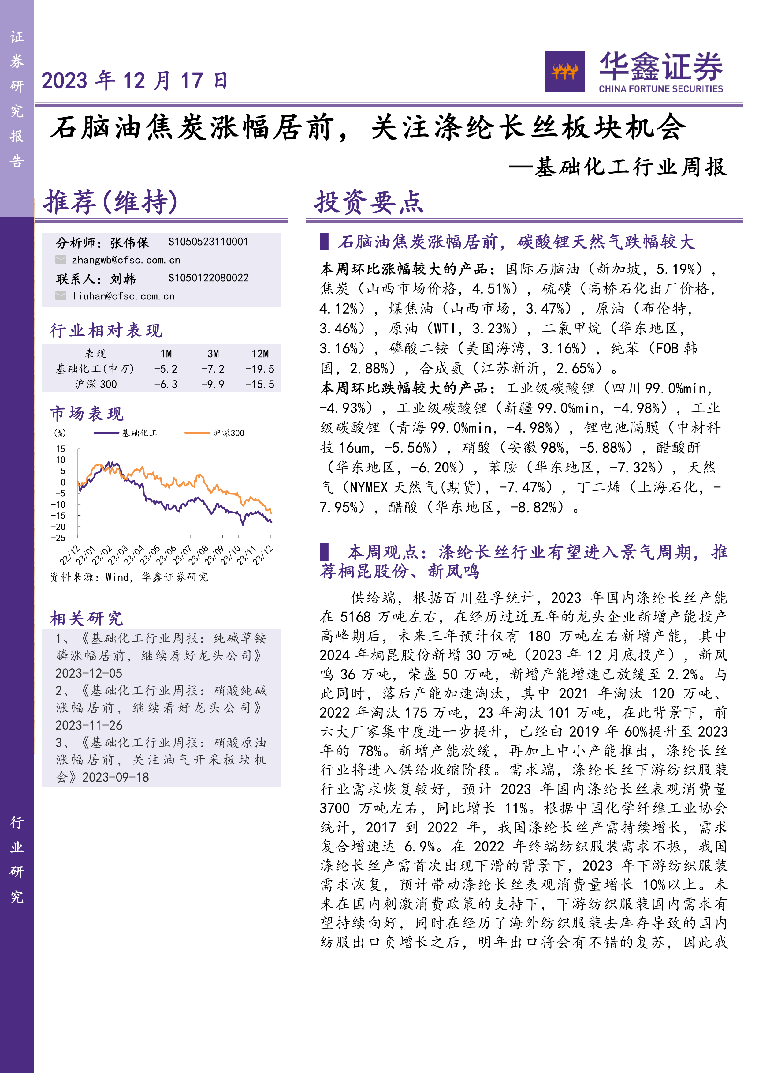 本报告的核心观点是:涤纶长丝行业有望进入景气周期,主要原因是供给端产能扩张放缓,落后产能加速淘汰,行业集中度提升;需求端纺织服装行业需求恢复,预计未来几年将保持增长。因此,报告推荐关注行业龙头桐昆股份和新凤鸣。此外,报告还分析了本周化工产品价格的涨跌情况,并对部分重点化工产品价格走势进行了预测。