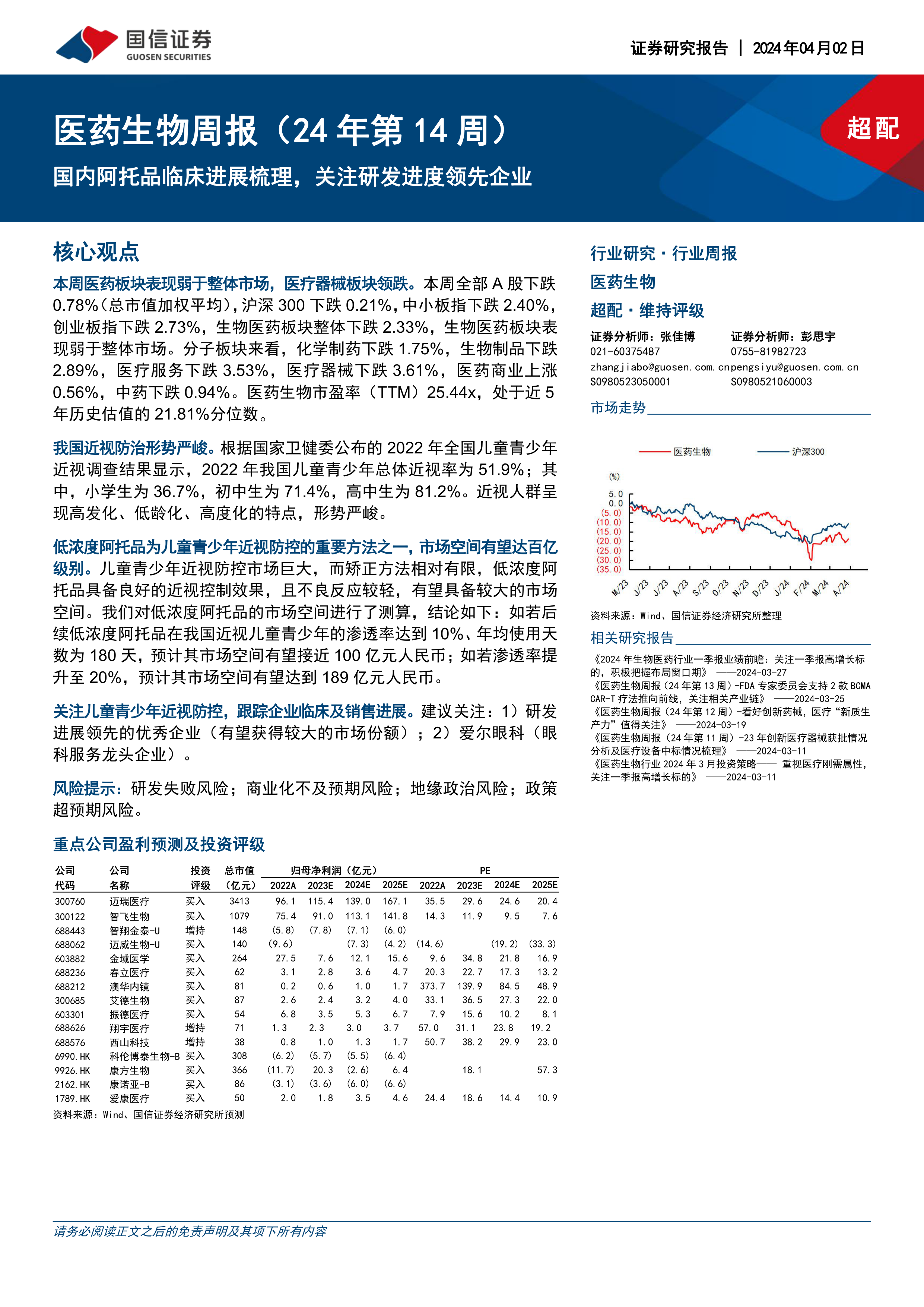 医药生物周报(24年第14周):国内阿托品临床进展梳理,关注研发进度领先企业
