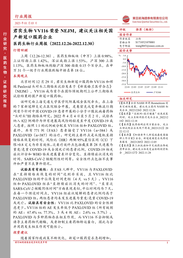 本报告的核心观点是:君实生物新冠口服药物VV116的三期临床试验结果发表于《新英格兰医学杂志》(NEJM),显示其疗效与辉瑞Paxlovid相当,安全性甚至更优,这在当前中国新冠口服药物供应不足的背景下,具有重要的市场意义。报告建议关注布局新冠口服药物的企业,例如君实生物、先声药业、众生药业和远大医药等。