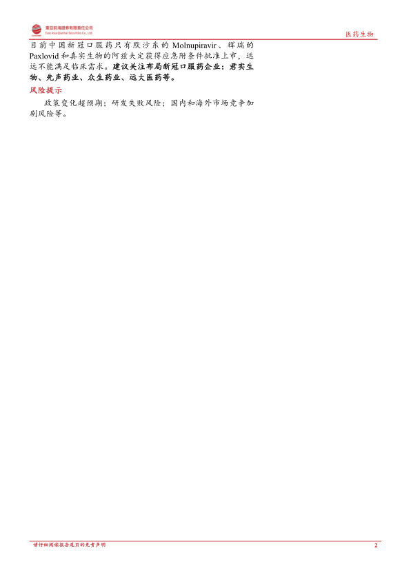 随着中国优化防疫政策,新冠口服药物的需求急剧增加,而目前市场上的药物供应远不能满足需求。 VV116的成功为国内新冠口服药物市场注入了新的活力,也为投资者提供了新的投资机会。 报告建议关注布局新冠口服药物的企业,并提示了政策变化、研发失败以及市场竞争加剧等风险。