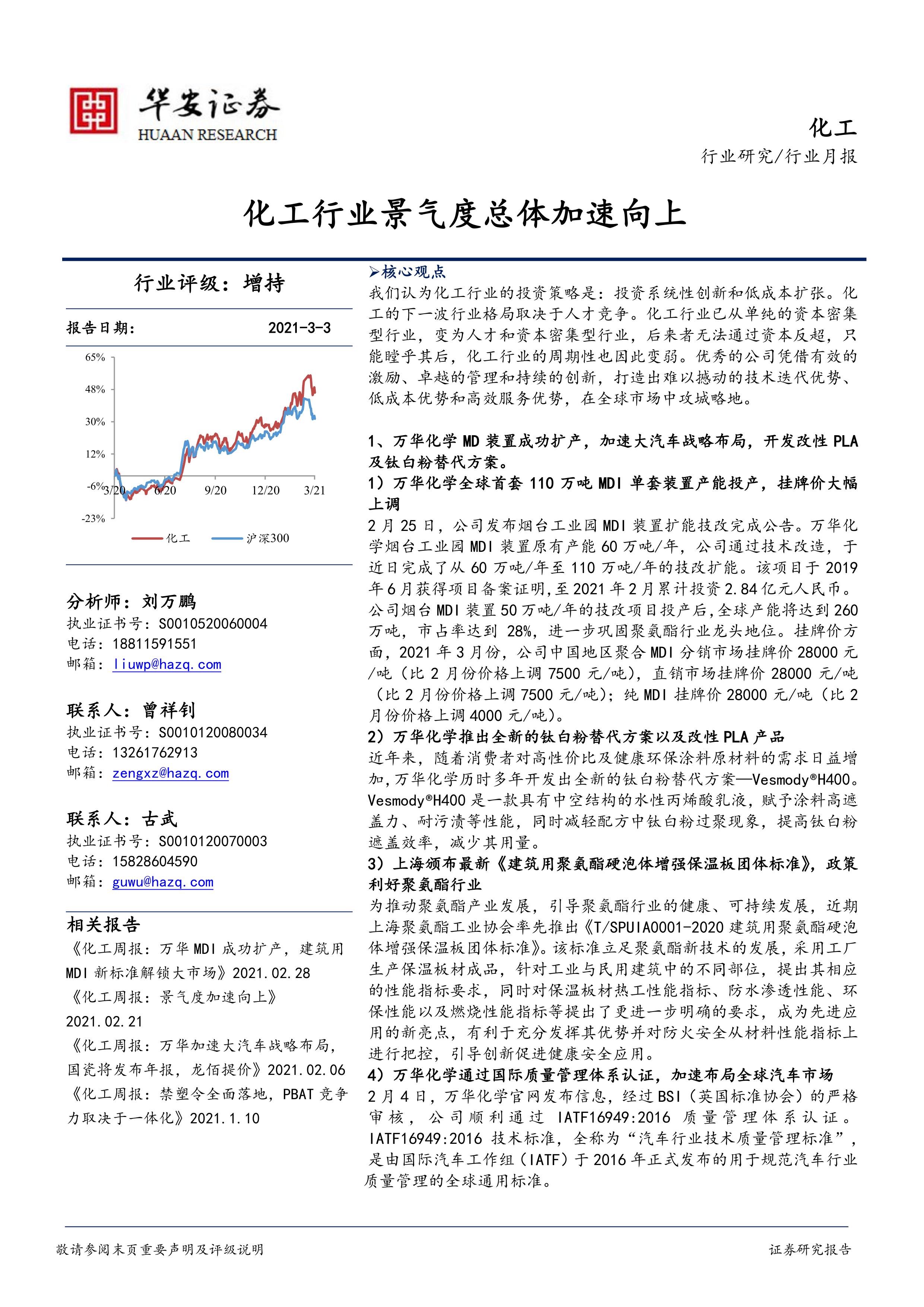 本报告通过对 2021 年 3 月化工行业重点事件和多家上市公司信息的分析,得出化工行业景气度加速向上的结论。 万华化学的 MDI 扩产和新产品布局,国瓷材料的精益管理和技术创新,以及龙蟒佰利的成本优势,都展现了行业内部分公司的强劲发展势头。然而,行业也面临着政策扰动、技术扩散、新技术突破、全球知识产权争端、全球贸易争端、碳排放趋严等风险。 未来,化工行业的竞争将更加激烈,人才竞争将成为决定行业格局的关键因素。 投资策略应侧重于系统性创新和低成本扩张,选择具有核心竞争力和持续创新能力的企业进行投资。