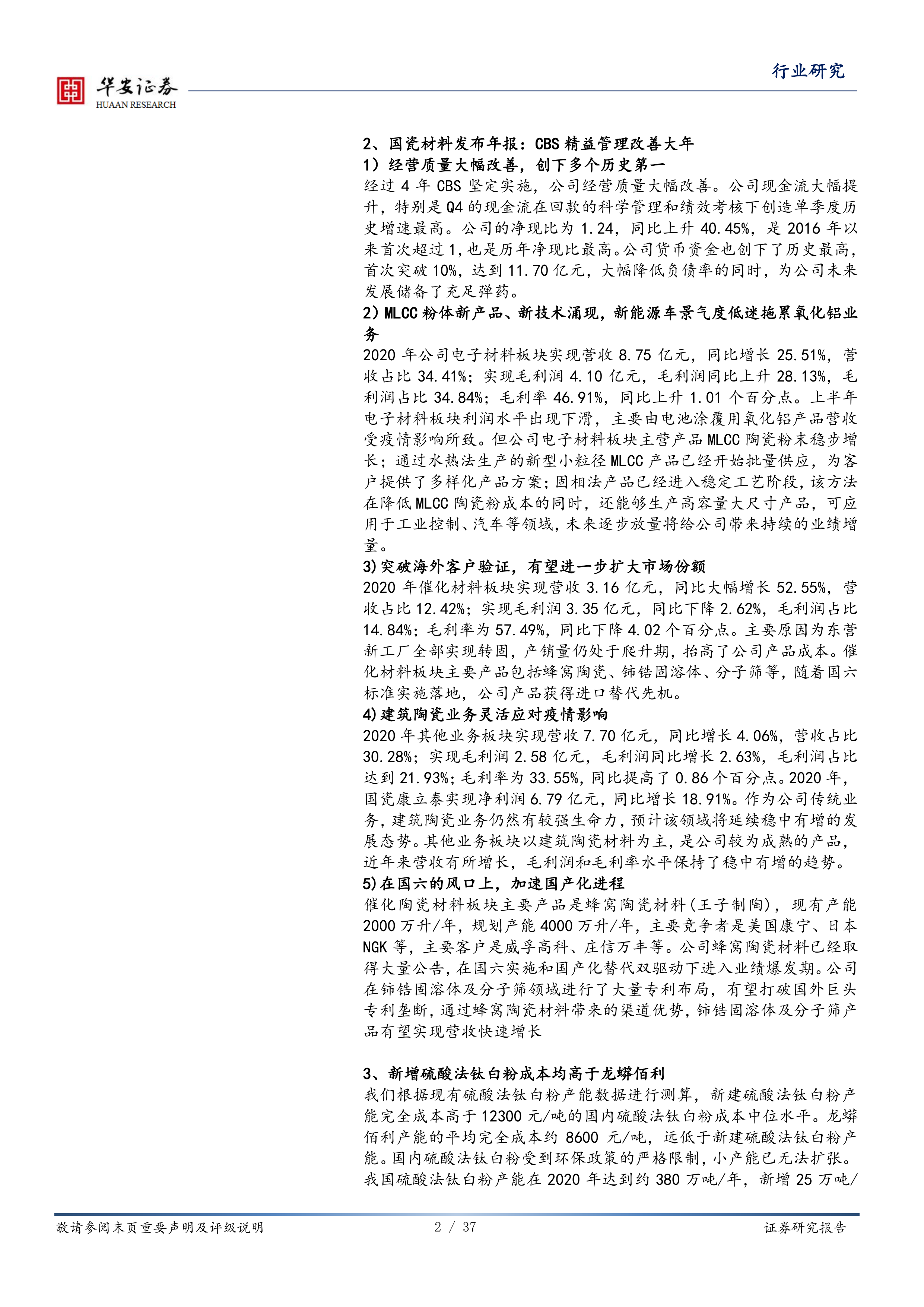 国瓷材料发布年报: 国瓷材料 2020 年年报显示,公司经营质量大幅改善,现金流和货币资金均创历史新高。MLCC 粉体新产品和新技术涌现,但新能源车景气度低迷拖累氧化铝业务。催化材料板块受益于国六标准实施,实现快速增长。建筑陶瓷业务保持稳中有增。