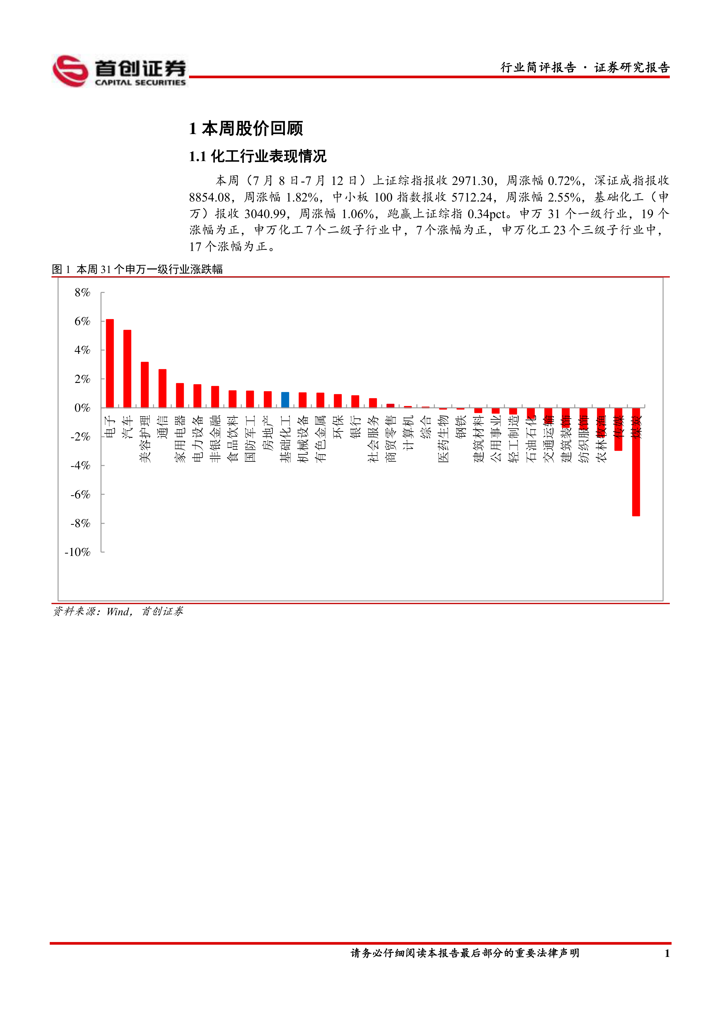 本周(7月8日-7月12日)上证综指报收2971.30,周涨幅0.72%,深证成指报收8854.08,周涨幅1.82%,中小板100指数报收5712.24,周涨幅2.55%,基础化工(申万)报收3040.99,周涨幅1.06%,跑赢上证综指0.34pct。申万31个一级行业,19个涨幅为正,申万化工7个二级子行业中,7个涨幅为正,申万化工23个三级子行业中,17个涨幅为正。涨幅居前的个股有远翔新材、*ST宁科、亚邦股份、金力泰、鲁北化工、赤天化、鹿山新材、雅运股份、祥源新材、晨光新材。