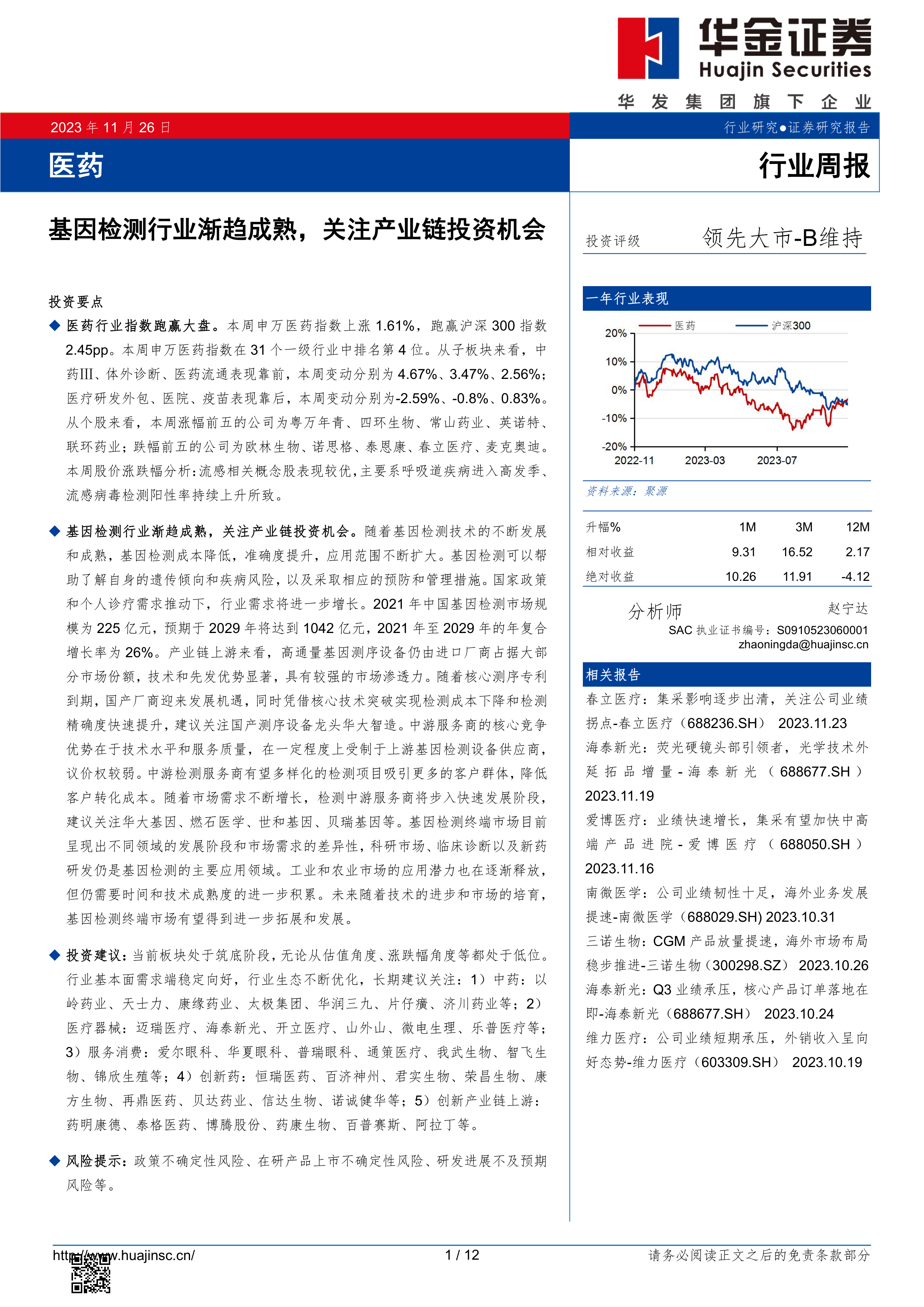 医药行业周报:基因检测行业渐趋成熟,关注产业链投资机会