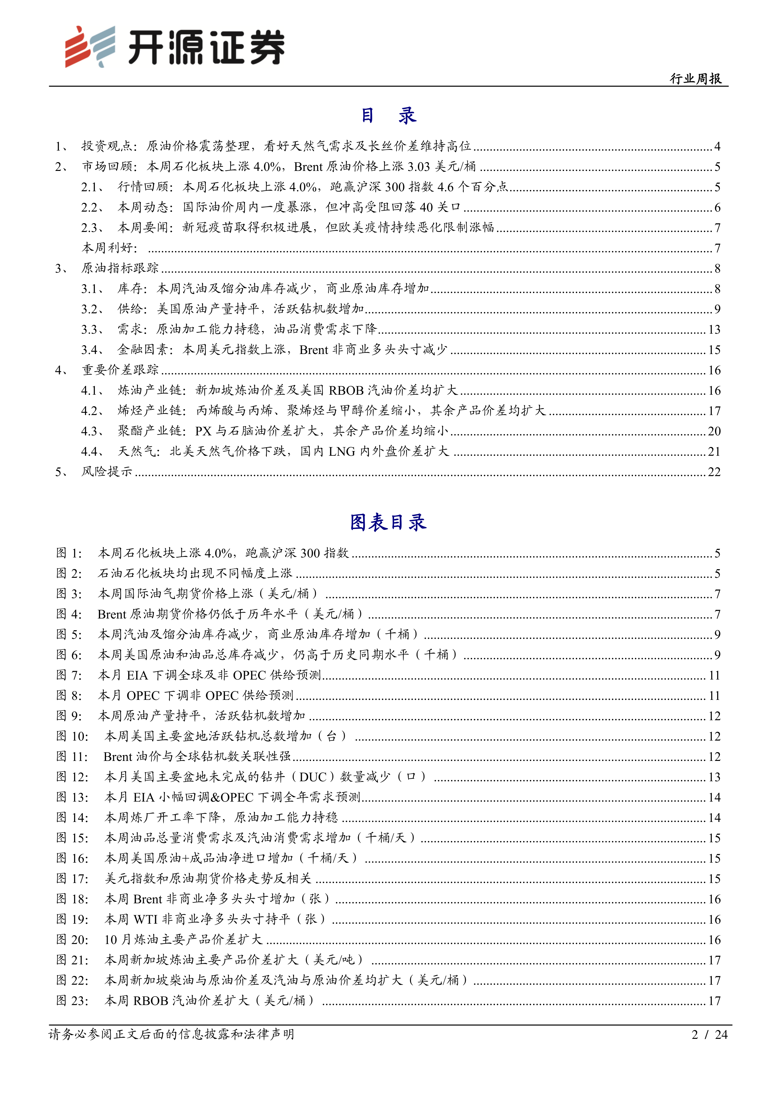 本报告对石油化工行业近期市场表现进行了全面分析,重点关注了原油价格、天然气市场和聚酯产业链的动态。疫苗进展和地缘政治因素对油价产生显著影响,而国家政策和季节性因素则驱动天然气市场。涤纶长丝市场表现良好,价差维持高位。报告最后指出了行业面临的潜在风险,并给出了投资建议,看好天然气需求和涤纶长丝价差维持高位,建议关注相关受益标的。 然而,投资者需谨慎关注原油价格波动、地缘政治风险以及疫情反复等因素对市场的影响。