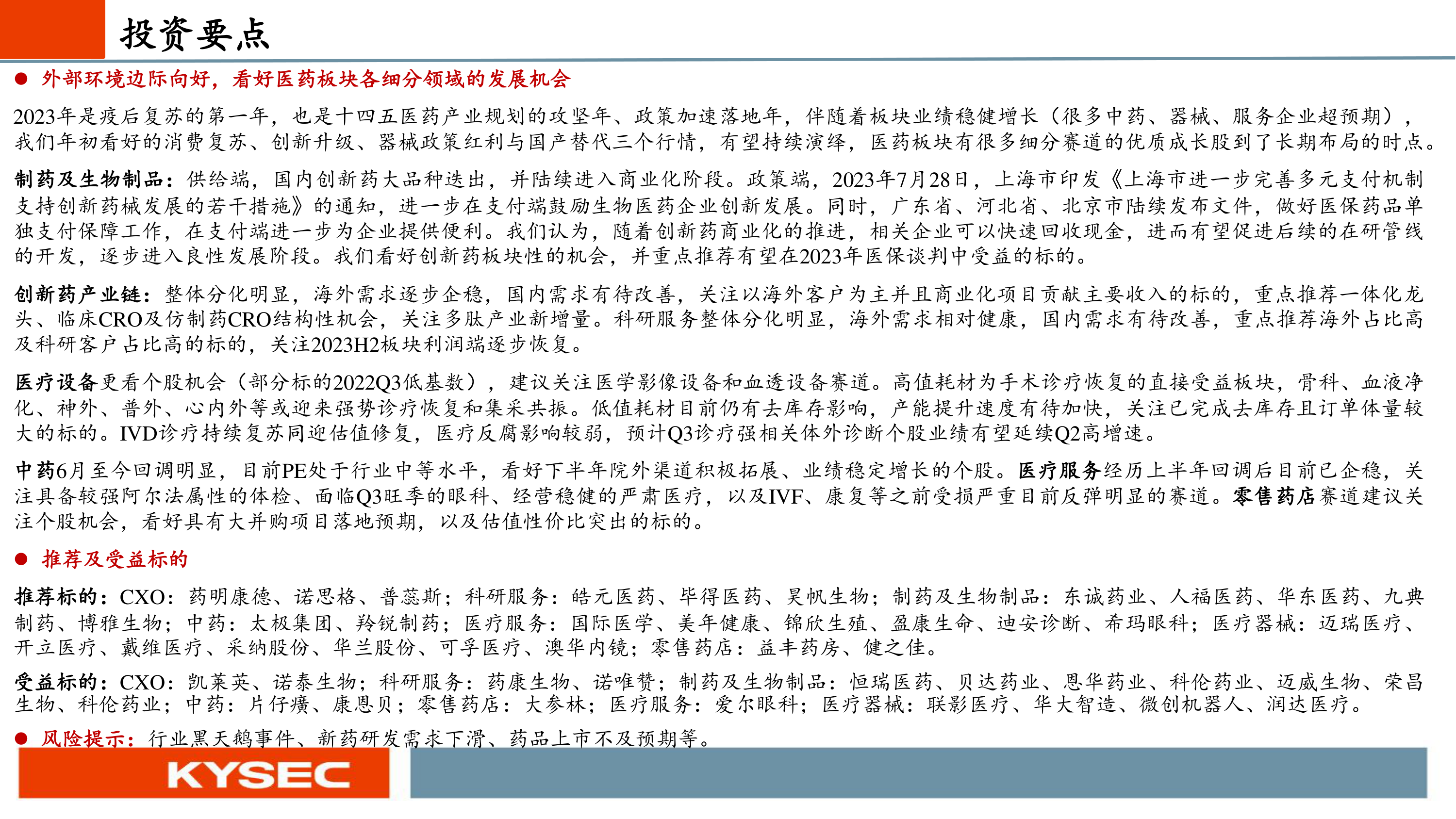 受益标的: CXO:凯莱英、 诺泰生物;科研服务:药康生物、 诺唯赞;制药及生物制品:恒瑞医药、 贝达药业、 恩华药业、 科伦药业、 迈威生物、 荣昌生物、 科伦药业;中药:片仔癀、 康恩贝;零售药店:大参林;医疗服务:爱尔眼科;医疗器械:联影医疗、 华大智造、 微创机器人、 润达医疗。