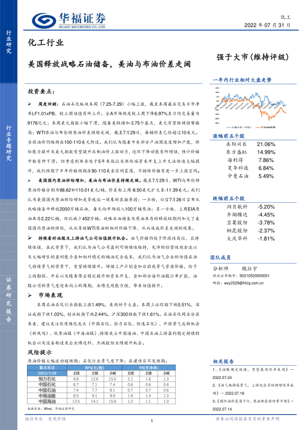 化工行业:美国释放战略石油储备,美油与布油价差走阔