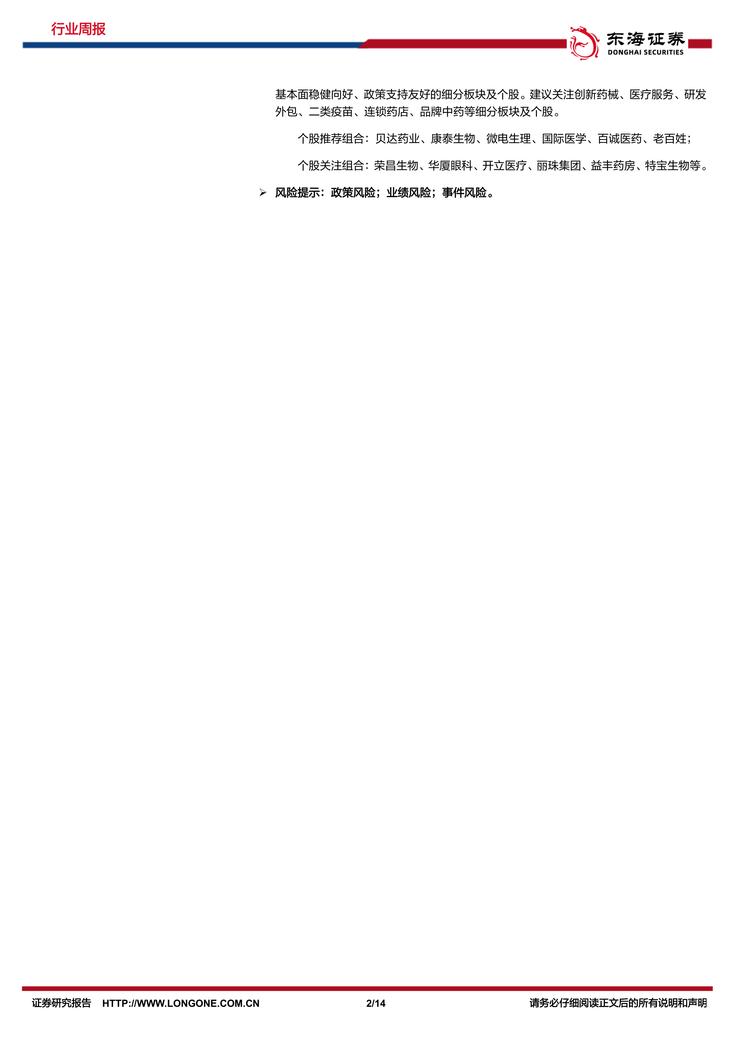 个股关注组合:荣昌生物、华厦眼科、开立医疗、丽珠集团、益丰药房、特宝生物等。