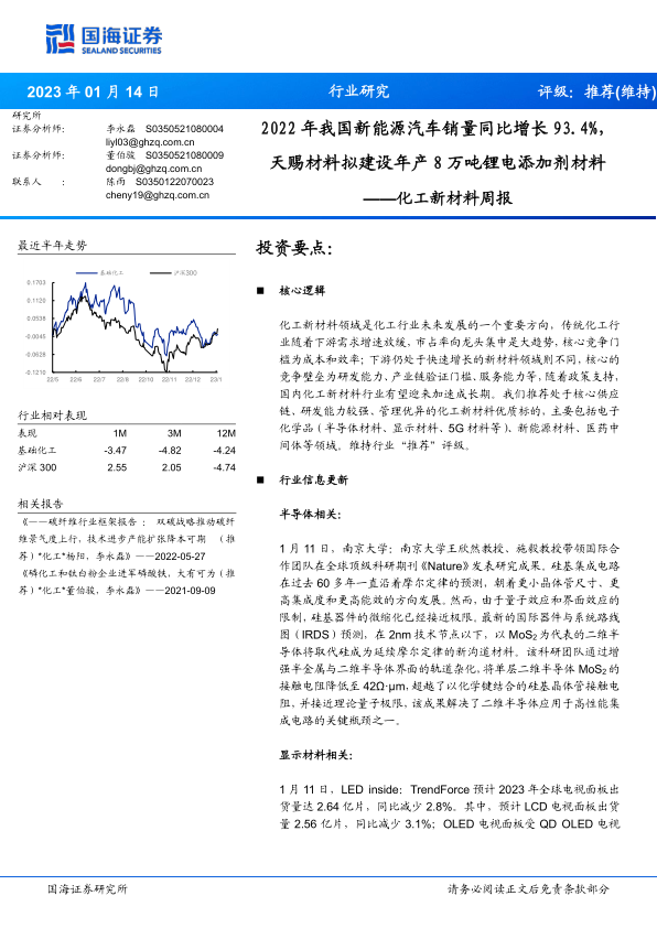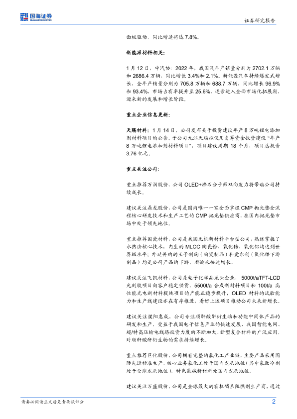 本节详细更新了半导体材料、显示材料、新能源材料和其他材料等领域的重点公司信息,包括行业信息、公司公告和产业数据。 例如,报告提及了南京大学在二维半导体材料研究方面的突破,以及2022年中国新能源汽车销量同比增长93.4%的显著数据,这些信息都对相关领域的投资具有重要的参考价值。 此外,报告还列出了多家重点公司的公告信息,例如天赐材料投资建设年产8万吨锂电添加剂材料项目等。