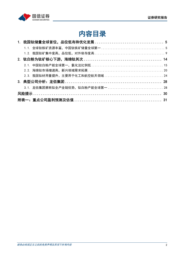 风险提示:钛矿价格波动、行业政策变化、环保政策、竞争加剧、技术创新和产品升级、地质勘探、供应链、国际贸易摩擦、汇率风险等。