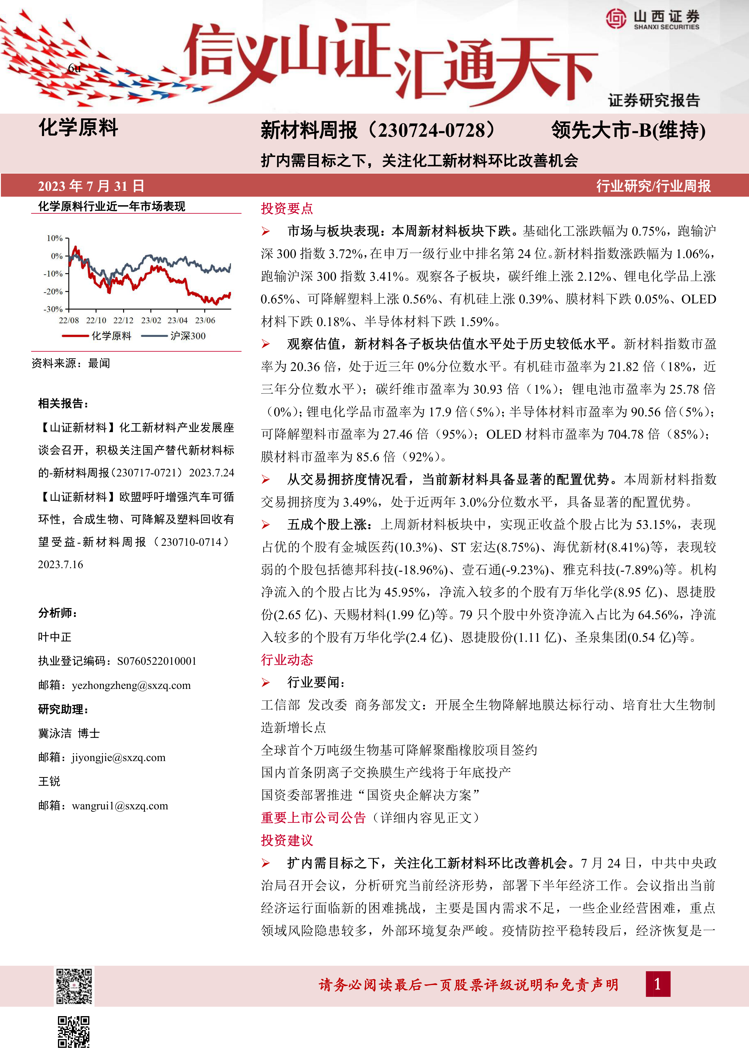 本报告基于山西证券研究所发布的《6u 化学原料 新材料周报(230724-0728)》进行分析,主要内容包括: