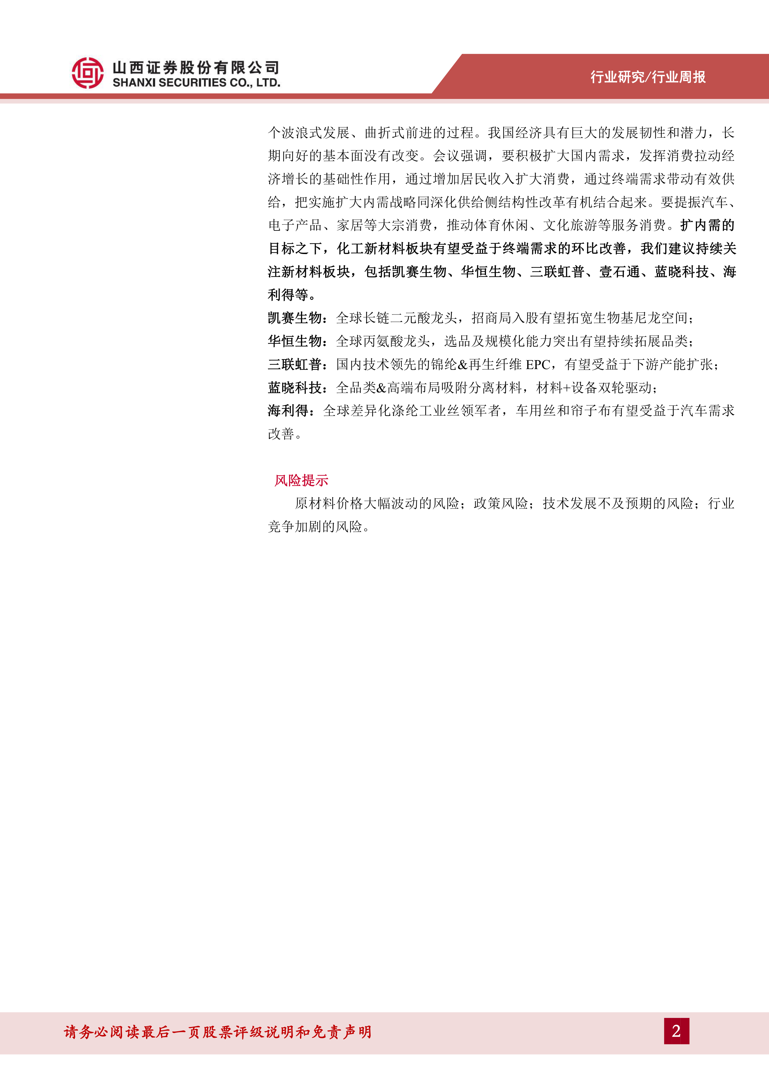 中共中央政治局会议强调积极扩大内需,提振大宗消费,这将为化工新材料行业带来终端需求的环比改善机会,部分细分领域有望受益。