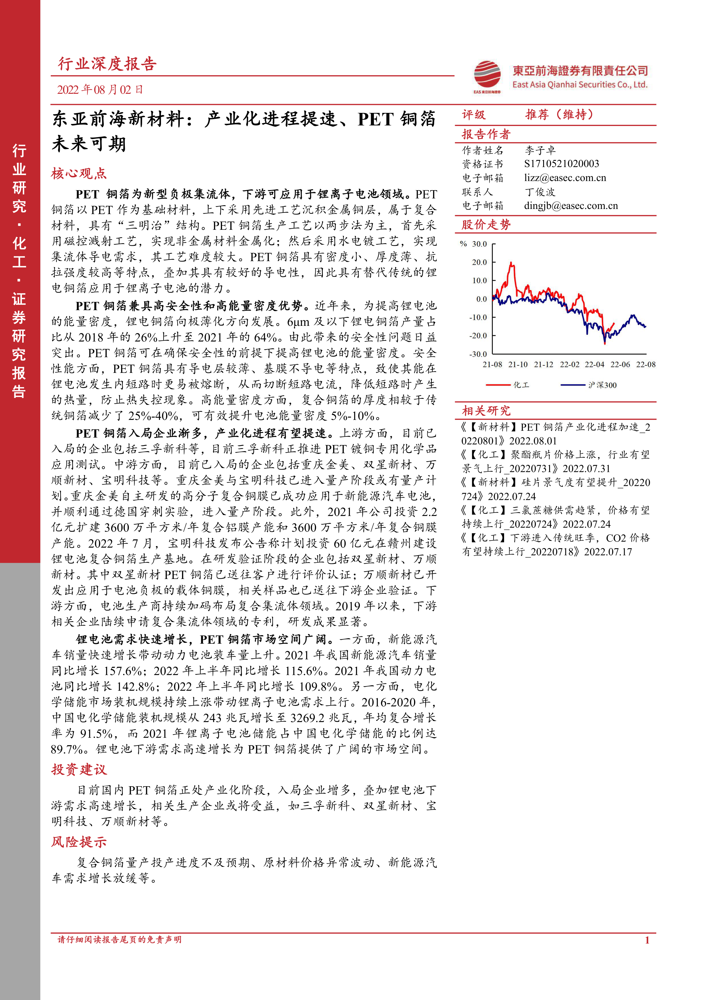 东亚前海新材料:产业化进程提速、PET铜箔未来可期