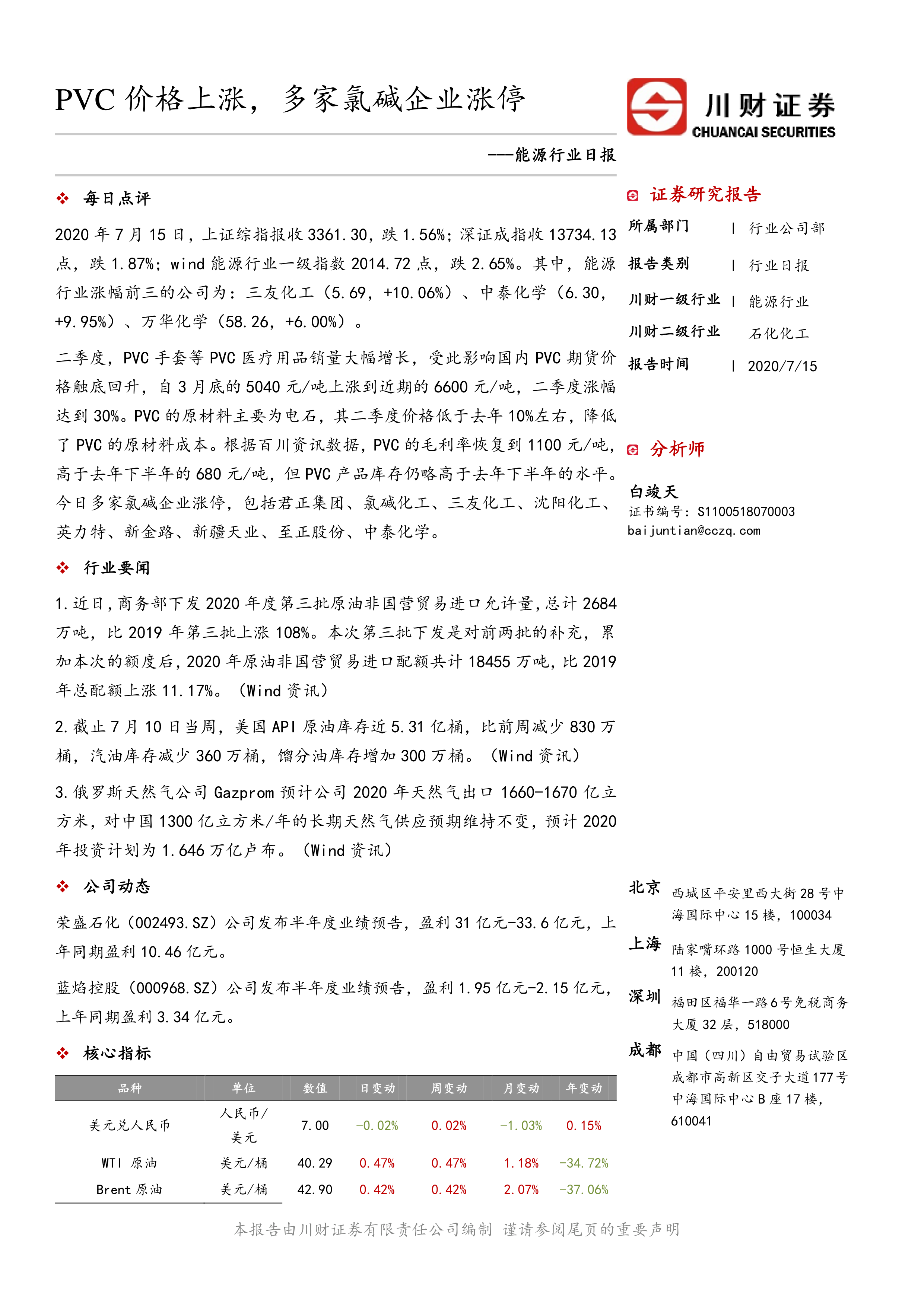 报告简要介绍了几个重要的行业要闻,例如商务部下发2020年度第三批原油非国营贸易进口允许量,以及美国API原油库存数据等。此外,报告还提供了荣盛石化和蓝焰控股两家公司的半年度业绩预告。