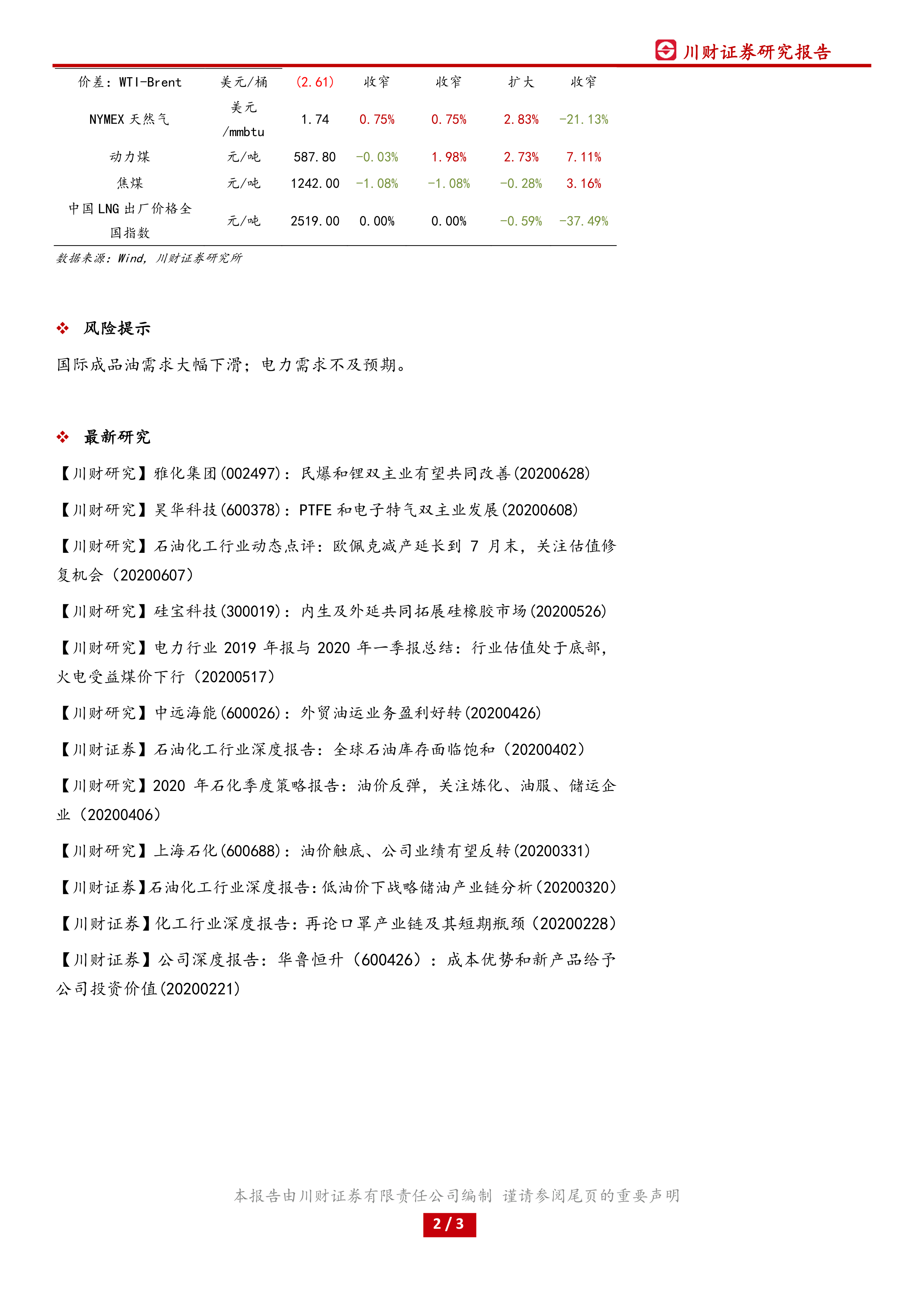 报告列出了美元兑人民币汇率、WTI原油、Brent原油、NYMEX天然气、动力煤、焦煤、中国LNG出厂价格等核心指标的数值及涨跌幅,并提示了国际成品油需求大幅下滑和电力需求不及预期的风险。
