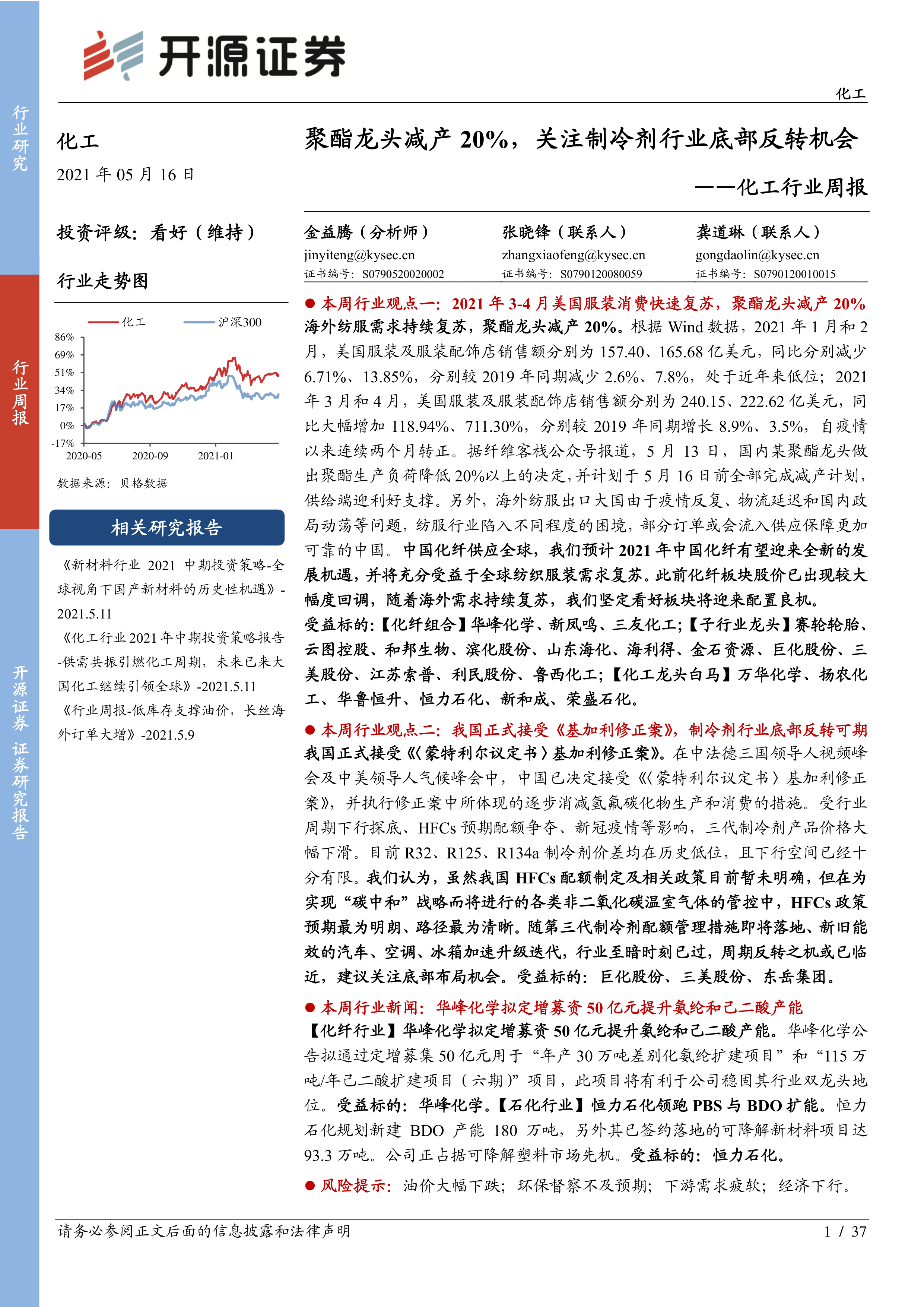 本报告基于公开数据对化纤和制冷剂行业进行了分析,认为这两个行业都面临着重要的发展机遇。化纤行业受益于海外需求复苏和国内供给侧的调整,而制冷剂行业则受益于中国正式接受《基加利修正案》,政策明朗化推动行业底部反转。报告建议投资者关注相关龙头企业的投资机会,同时提示了油价下跌、环保督察不及预期、下游需求疲软以及经济下行等潜在风险。 报告内容涵盖了股票行情、价格走势、价差分析以及行业新闻点评等多个方面,为投资者提供了较为全面的市场信息和分析。 需要注意的是,报告中提到的投资建议仅供参考,投资者应根据自身情况进行独立判断。
