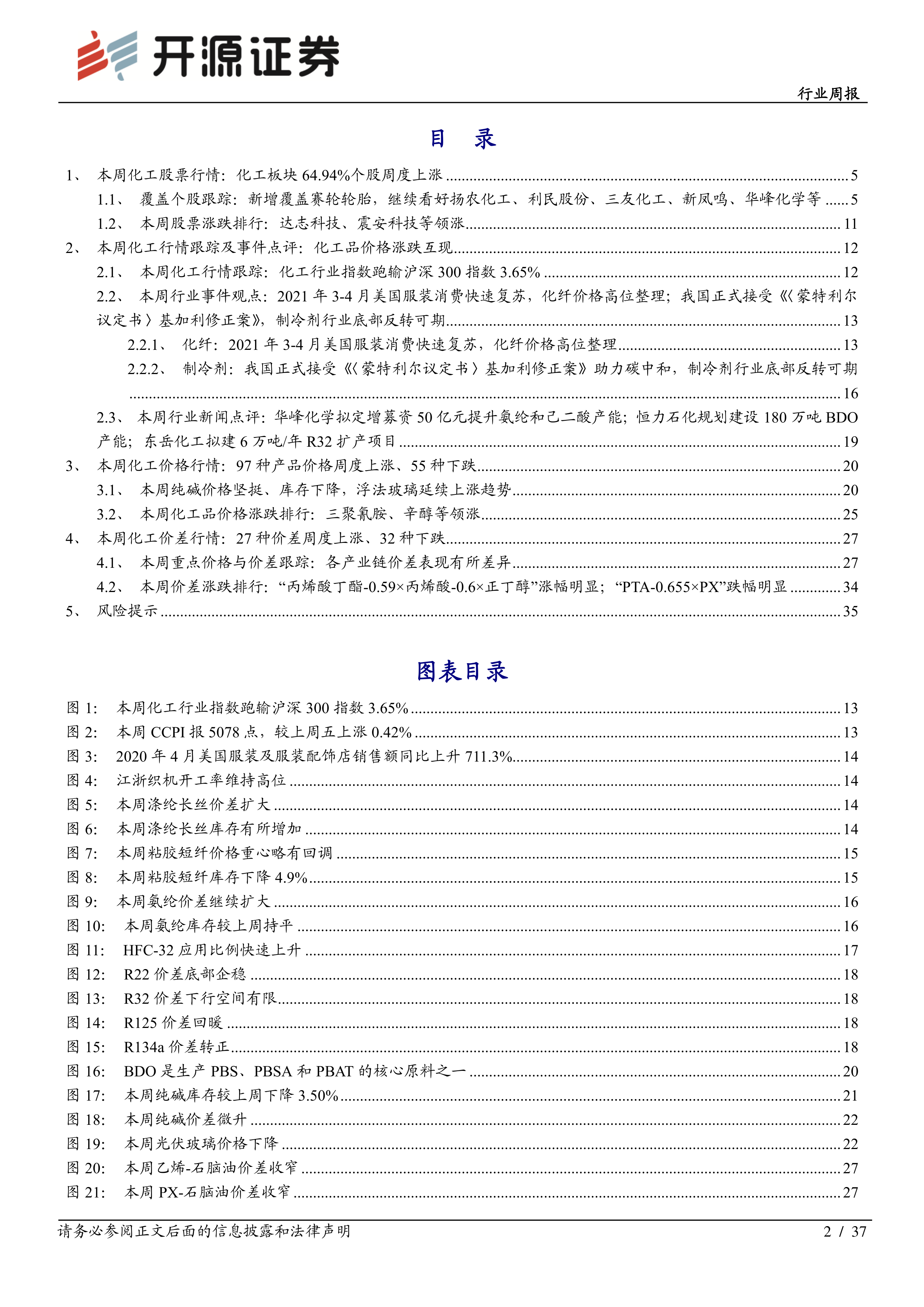 本周化工行业周报指出,2021年3-4月美国服装消费快速复苏,同比大幅增长,显示出海外纺服需求的强劲回暖。同时,由于印度等多个纺织服装出口大国面临疫情反复、物流延迟和政局动荡等问题,部分订单流向中国,进一步利好中国化纤行业。国内聚酯龙头企业减产20%,也为供给端提供了支撑。报告中提供了美国服装销售额数据以及江浙织机开工率数据,佐证了海外需求复苏和国内生产的积极态势。 报告建议关注的化纤组合标的包括华峰化学、新凤鸣、三友化工,以及赛轮轮胎、云图控股等子行业龙头,以及万华化学等化工龙头白马股。 报告还详细分析了涤纶长丝、粘胶短纤和氨纶等主要化纤品种的价格、库存和价差情况,并对未来走势进行了预测。
