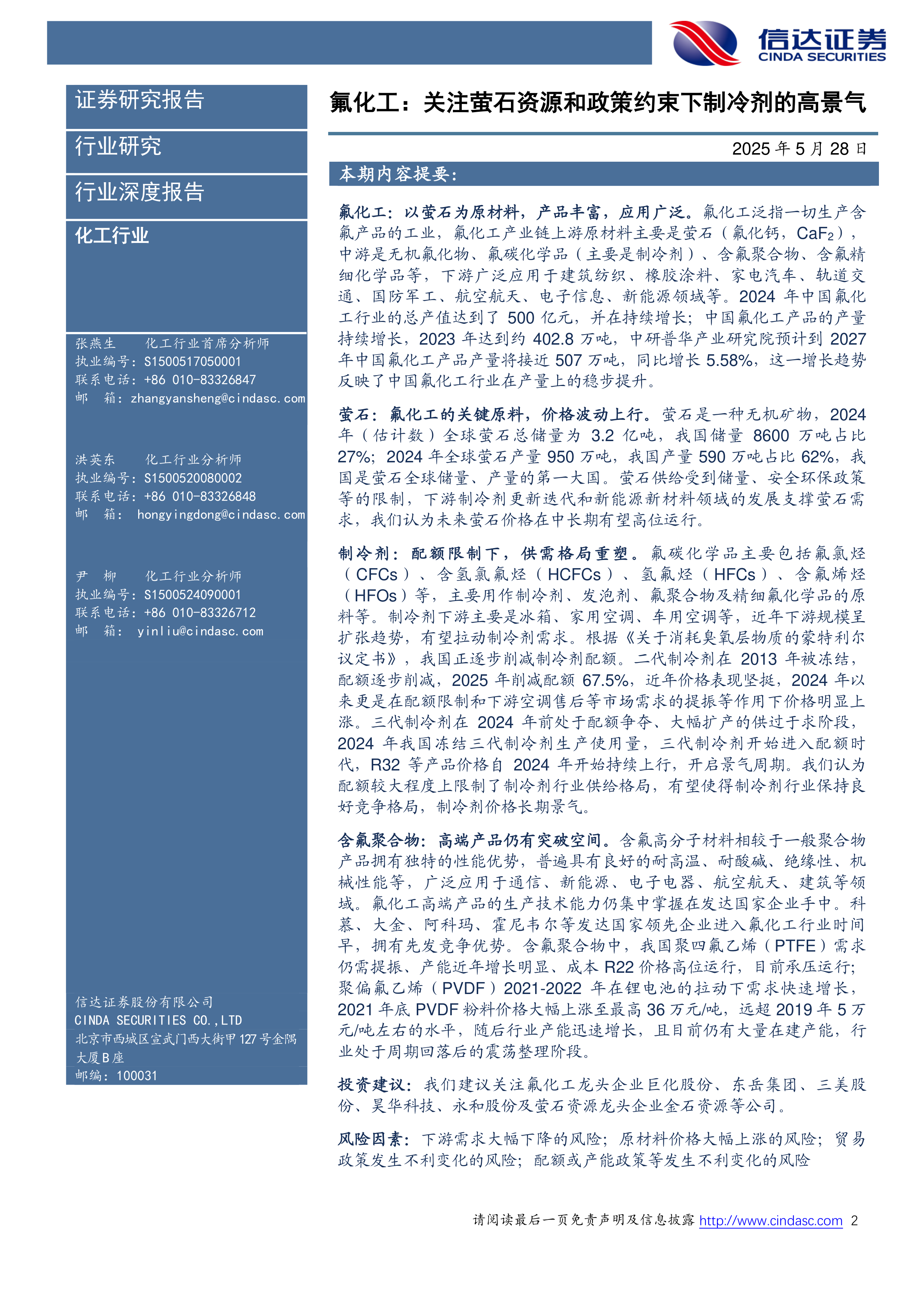 本报告的核心观点是:氟化工行业,特别是萤石资源和制冷剂市场,由于资源限制和政策约束,呈现出高景气度和较强的抗周期波动属性,值得关注。市场对氟化工板块的认知可能不足,未充分定价其抗周期性及政策红利。具体而言: