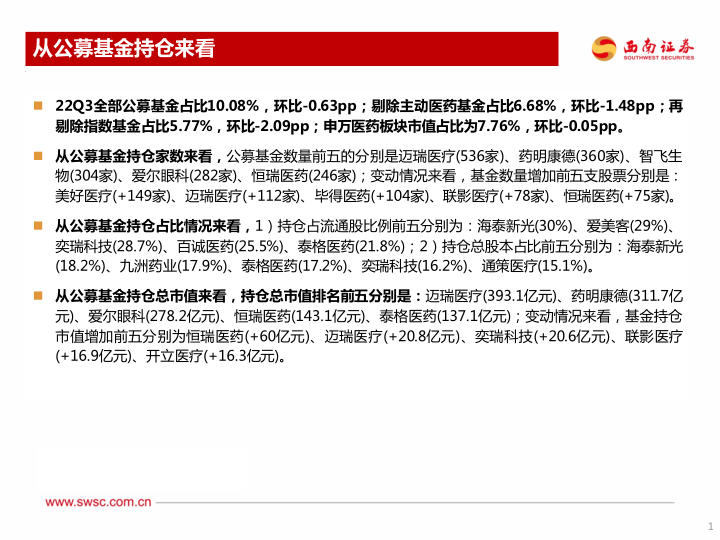 本报告通过对2022年Q3公募基金和陆股通持仓数据的分析,揭示了医药行业细分板块持仓结构的显著分化。化药和医疗设备板块受到资金的持续追捧,而部分细分领域如医疗研发外包、医院板块则受到资金的抛售。 部分个股的持仓数量和市值均出现大幅增长,反映了市场对这些公司的看好。 外资对医药板块的整体配置有所减少,但仍对部分个股保持关注。 投资者需密切关注市场动态,结合自身风险承受能力进行投资决策。 报告数据基于Wind数据库,存在一定的样本误差风险。