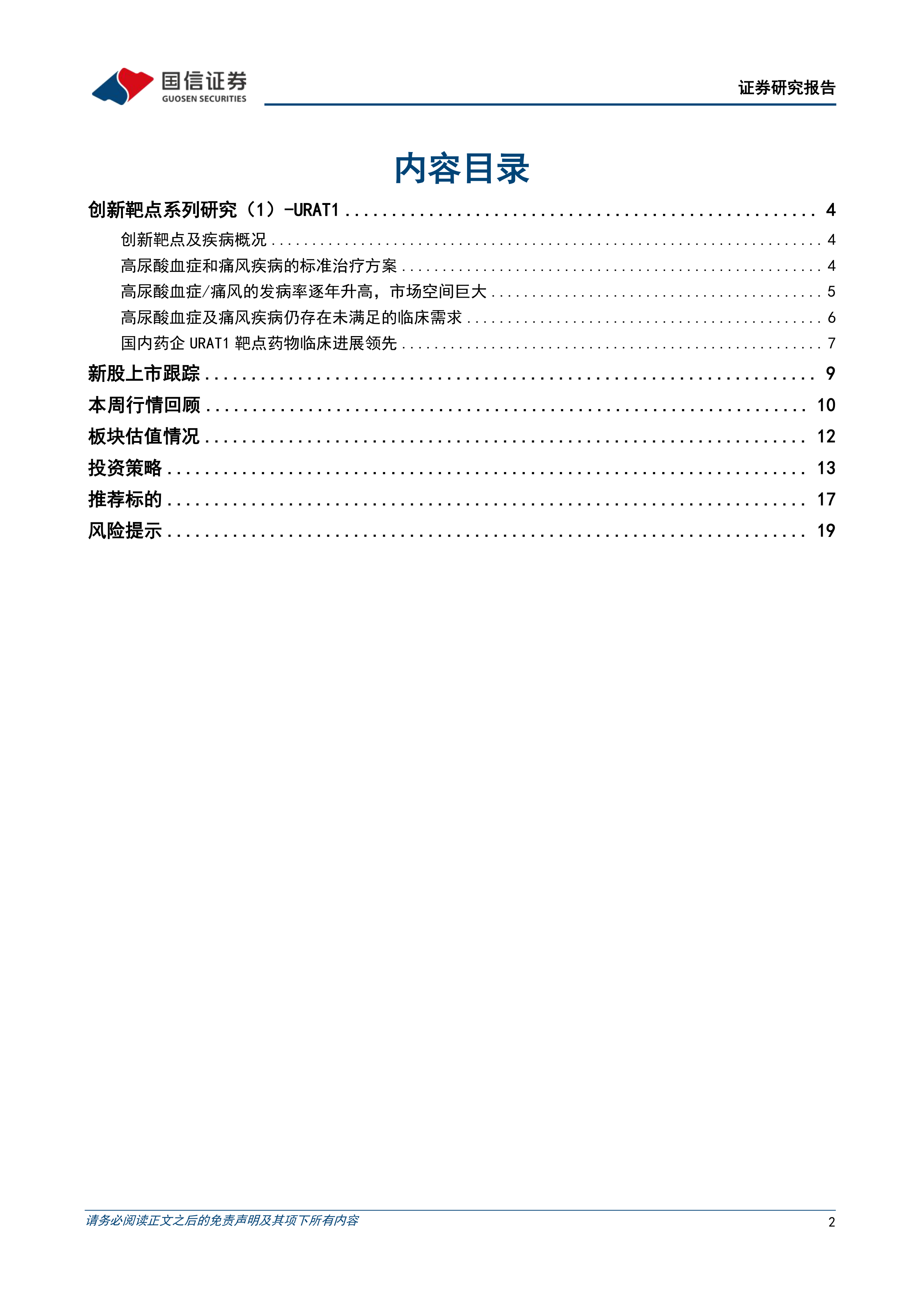 本报告的核心观点是:医药板块本周表现弱于大盘,但中报后板块机会值得关注,特别是创新药械产业链。高尿酸血症和痛风市场存在巨大未满足需求,国内药企在URAT1靶点药物研发方面进展领先,值得重点关注。此外,市场降息预期升温,CXO行业海外订单回暖,医疗设备更新政策持续推进,也为相关板块带来投资机会。