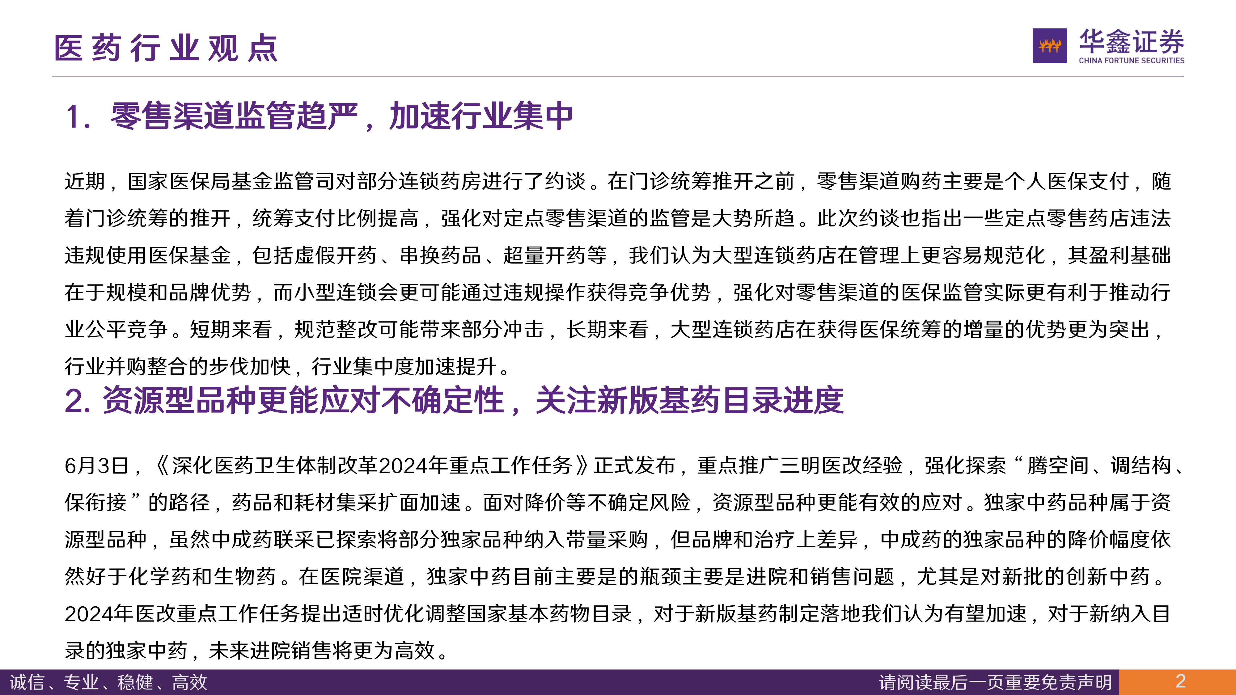 近期,国家医保局基金监管司对部分连锁药房进行了约谈。在门诊统筹推开之前,零售渠道购药主要是个人医保支付,随着门诊统筹的推开,统筹支付比例提高,强化对定点零售渠道的监管是大势所趋。此次约谈也指出一些定点零售药店违法违规使用医保基金,包括虚假开药、串换药品、超量开药等,我们认为大型连锁药店在管理上更容易规范化,其盈利基础在于规模和品牌优势,而小型连锁会更可能通过违规操作获得竞争优势,强化对零售渠道的医保监管实际更有利于推动行业公平竞争。短期来看,规范整改可能带来部分冲击,长期来看,大型连锁药店在获得医保统筹的增量的优势更为突出,行业并购整合的步伐加快,行业集中度加速提升。