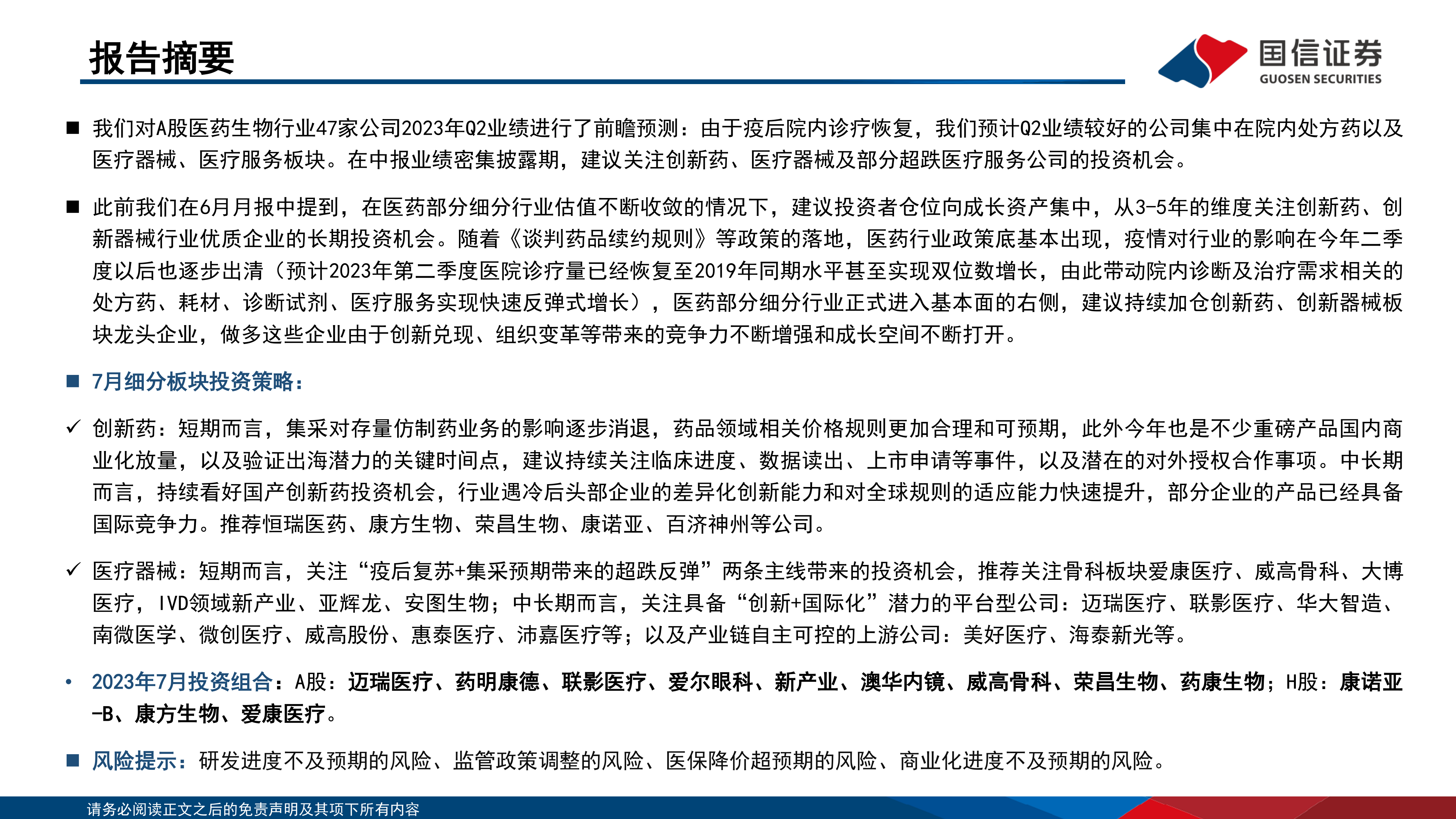 本报告的核心观点是:2023年二季度,受疫情影响消退和院内诊疗需求强劲恢复的推动,A股医药生物行业整体业绩呈现向好趋势。报告建议投资者关注创新药、医疗器械及部分超跌医疗服务公司的投资机会,并持续加仓创新药、创新器械板块龙头企业。报告详细分析了不同细分板块(创新药、疫苗/血制品、中药、医疗器械、医疗服务、CXO和生命科学上游)的市场表现及投资策略,并给出了具体的投资组合建议。