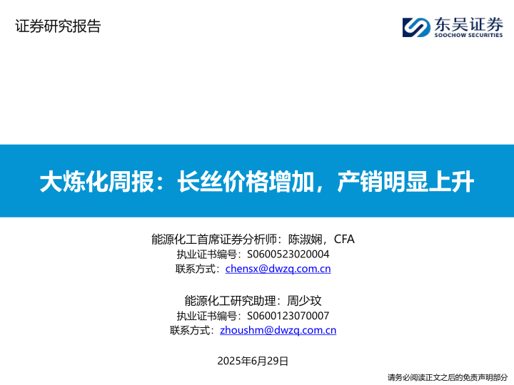 大炼化周报:长丝价格增加,产销明显上升