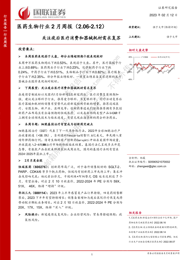 在疫情管制放松以及国内1月份新增2款新冠药后,医疗消费复苏预期加强,建议关注眼科子行业,推荐爱尔眼科、华夏眼科等;诊疗活动复苏后医疗器械和耗材的销售有望替代此前新冠检测贡献的增量,推荐迈瑞医疗、安图生物、新产业、亚辉龙等;创新药赛道我们继续推荐拥有多款创新药产品布局且有出海预期的恒瑞医药,以及在新结构类型产品如CAR-T上拥有全球领先技术与临床进度、有望兑现出海逻辑的药企科济药业。