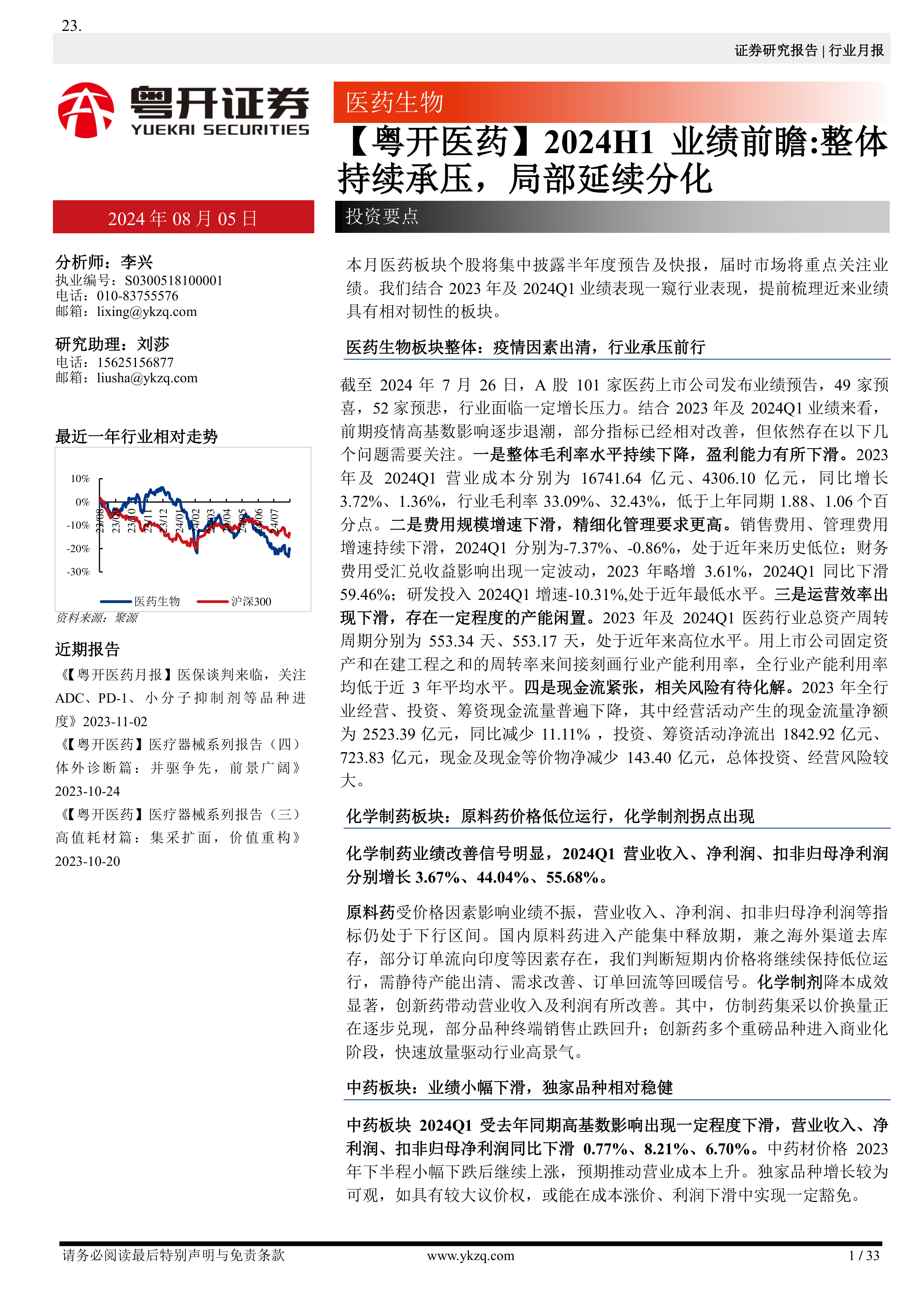 【粤开医药】2024H1业绩前瞻:整体持续承压,局部延续分化